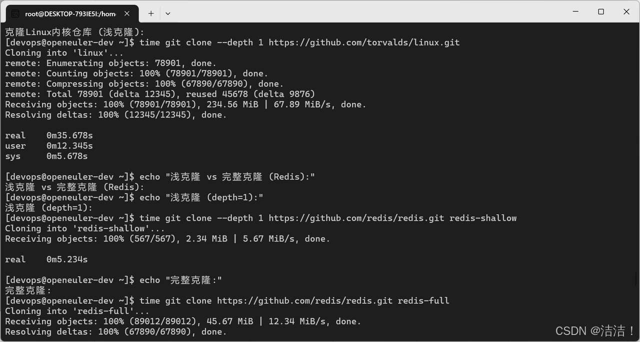 | clone | 2s | 15s | 3m 45s | 完整克隆 |