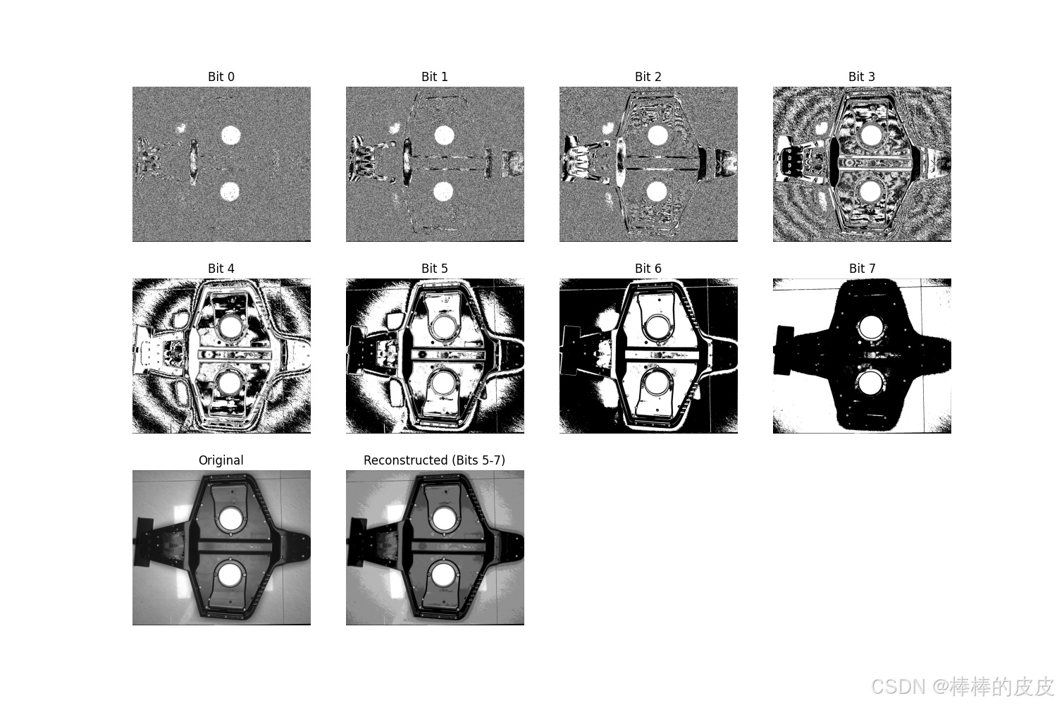 图像中每个像素的灰度值(uint8类型)可表示为 8 位二进制数:pixel = b7×2⁷ + b6×2⁶ + ... + b1×2¹ + b0×2⁰其中b7(最高位)到b0(最低位)分别对应第 7 到第 0 位平面。