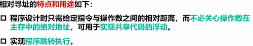 概念与机制:共享代码的"浮动"是指程序代码采用相对寻址 后,可以在主存中任意位置装入 而不影响执行正确性。这种寻址方式由程序计数器(PC)的内容加上指令中给定的偏移量来形成有效地址,即 EA = (PC) + A。由于操作数或跳转目标的地址用相对距离 表示而非固定绝对地址,代码中的指令地址随PC变化自动调整,两者始终相差一个固定偏移。这样一来,程序整体搬移到内存其他区域时,指令中的相对地址无需修改,依然指向正确的目标位置,从而保障程序在不同内存位置运行的正确性。这种利用相对寻址实现的代码位置无关性就是程序"浮动",意味着程序可以在内存的不同位置上运行 而无需更改代码。相对寻址特别广泛用于转移控制指令(如跳转、分支),利用偏移计算实现程序的跳转执行。例如,一条在地址0x100处的指令JMP 0x110,若采用相对寻址,其指令中实际存储的是偏移量+0x10。当整个程序从地址0x100搬移到0x200执行时,该跳转指令仍按偏移+0x10进行跳转:从PC=0x200跳到0x210,正好对应新位置中目标指令的地址0x210,从而实现正确跳转。由此可见,相对寻址使得程序代码的存放位置改变后,指令依然能依据固定偏移访问正确的地址,实现代码的自由浮动。