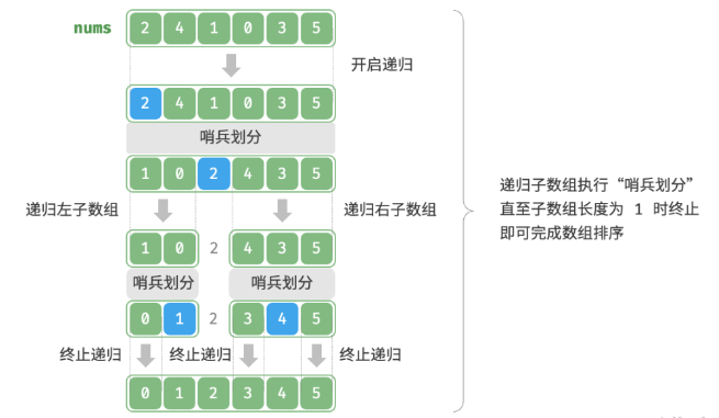 合并结果 :当递归调用结束后,整个数组已经被分成了以基准元素为界的左右两部分,左边部分小于等于基准元素,右边部分大于等于基准元素。此时整个数组已经有序。
