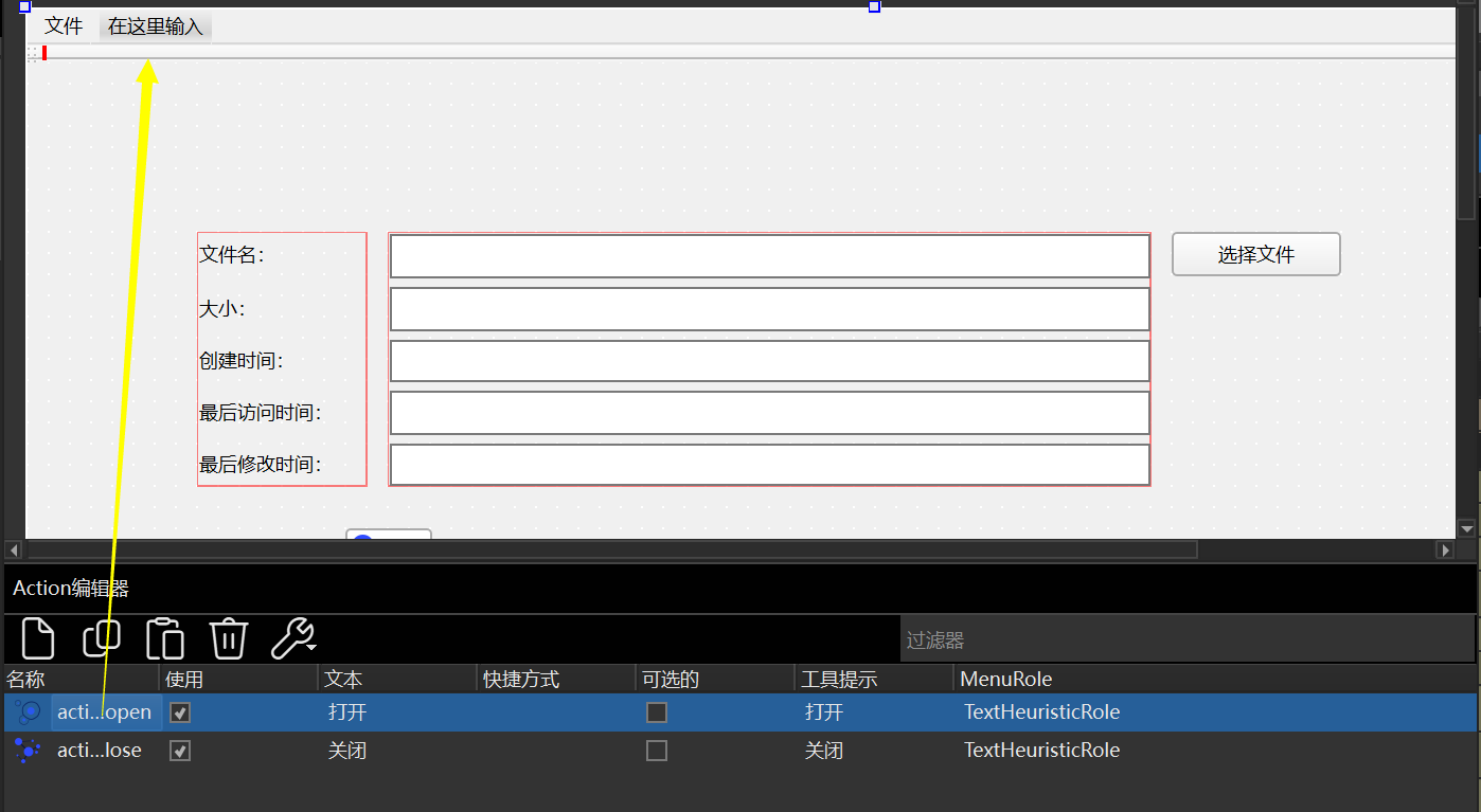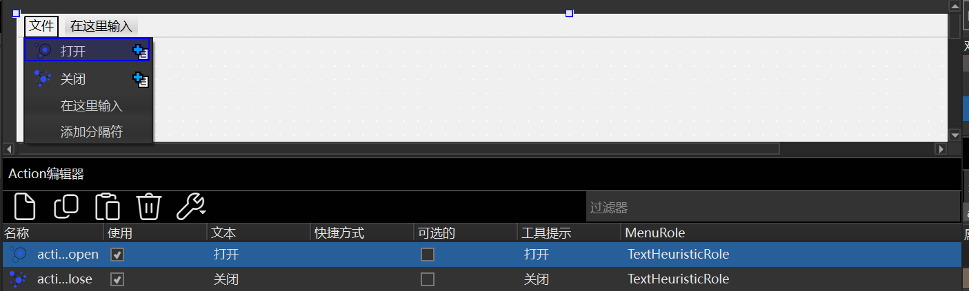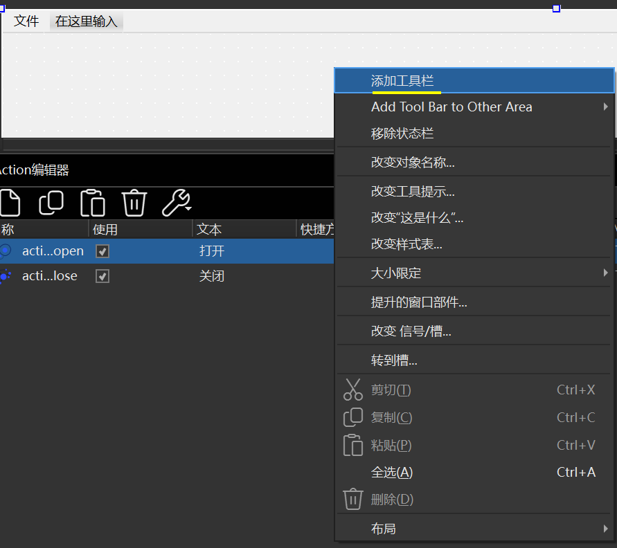 接着可以把下面Action编辑器的项目拖拽到工具栏