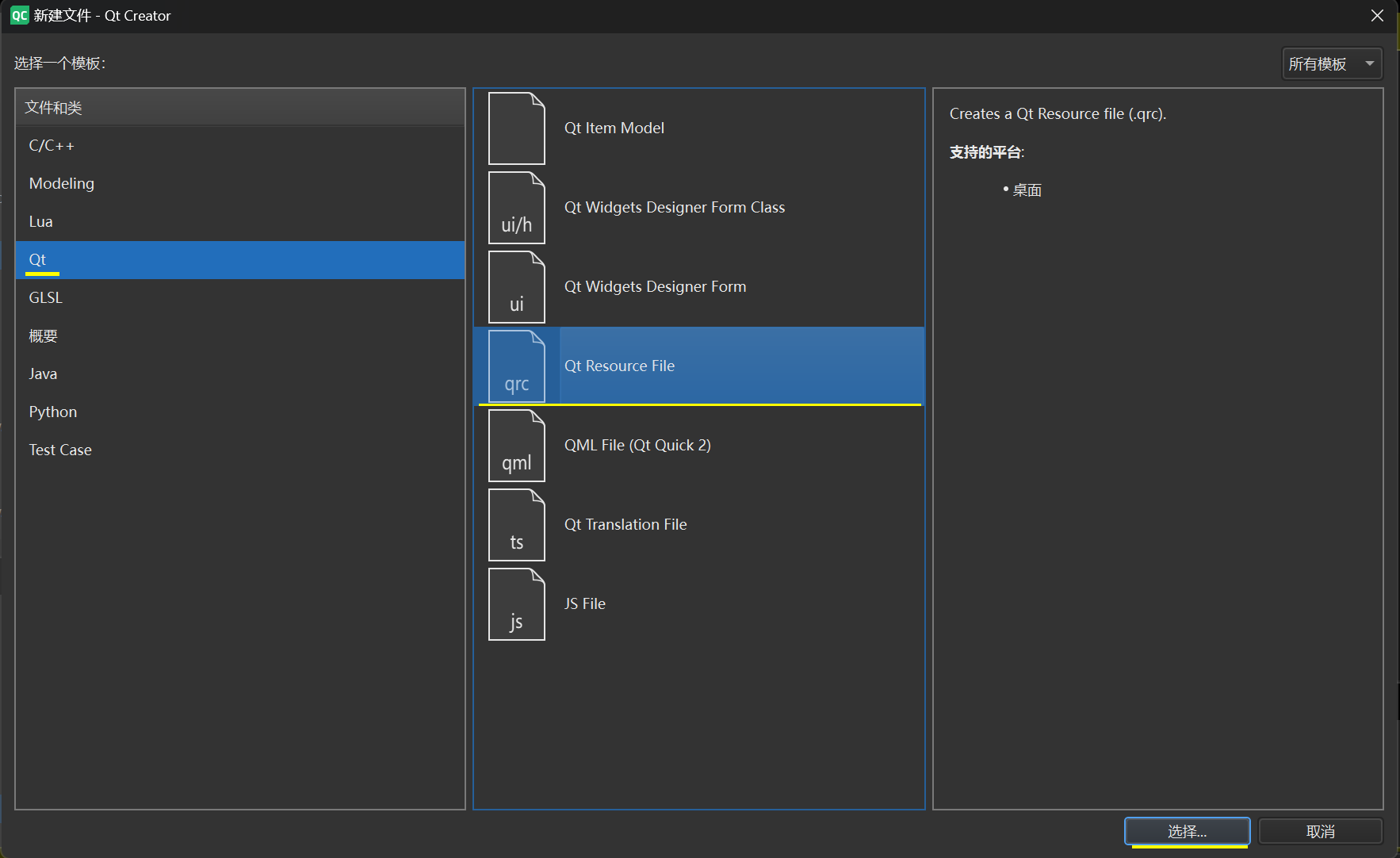 2、依次选择Qt->Qt Resourse File->选择