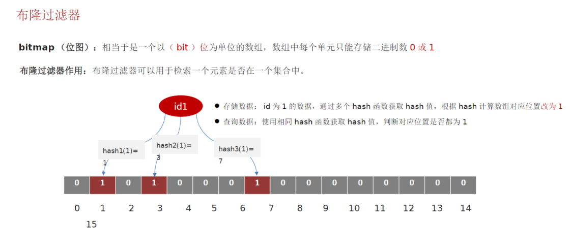 布隆过滤器主要是用于检索一个元素是否在一个集合中。它的底层原理是,先初始化一个比较大的数组,里面存放的是二进制0或1。一开始都是0,当一个key来了之后,经过3次hash计算,在模数组长度找到数据的下标,然后把数组中原来的0改为1。这样,三个数组的位置就能标明一个key的存在。查找的过程也是一样的。当然,布隆过滤器有可能会产生一定的误判,因为不同的ket可能会计算出相同的位置,一般数组长度越小越容易出现覆盖。我们一般可以设置这个误判率,大概不会超过5%。其实这个误判是必然存在的,要不就得增加数组的长度。5%以内的误判率一般的项目也能接受,不至于高并发下压倒数据库。