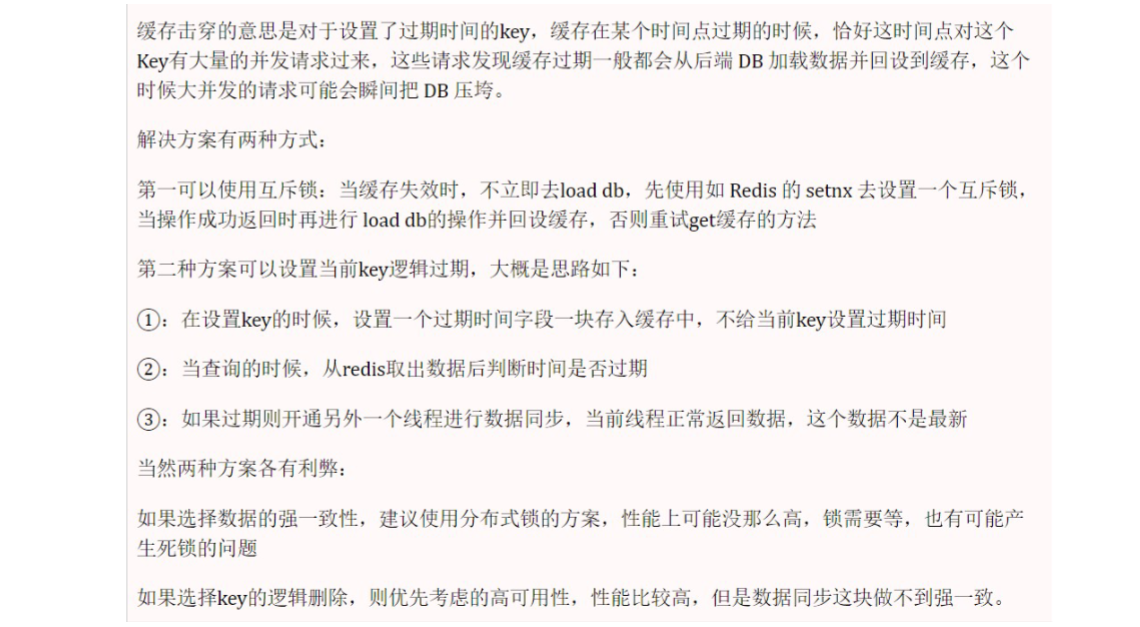 缓存击穿指的是对于设置了过期时间的key,缓存在某个时间点过期的时候,恰好这个时间点对这个Key有大量的并发请求过来。这些请求发现缓存过期,一般都会从后端 DB 加载数据并回设到缓存,这个时候大并发的请求可能会瞬间把 DB 压垮。