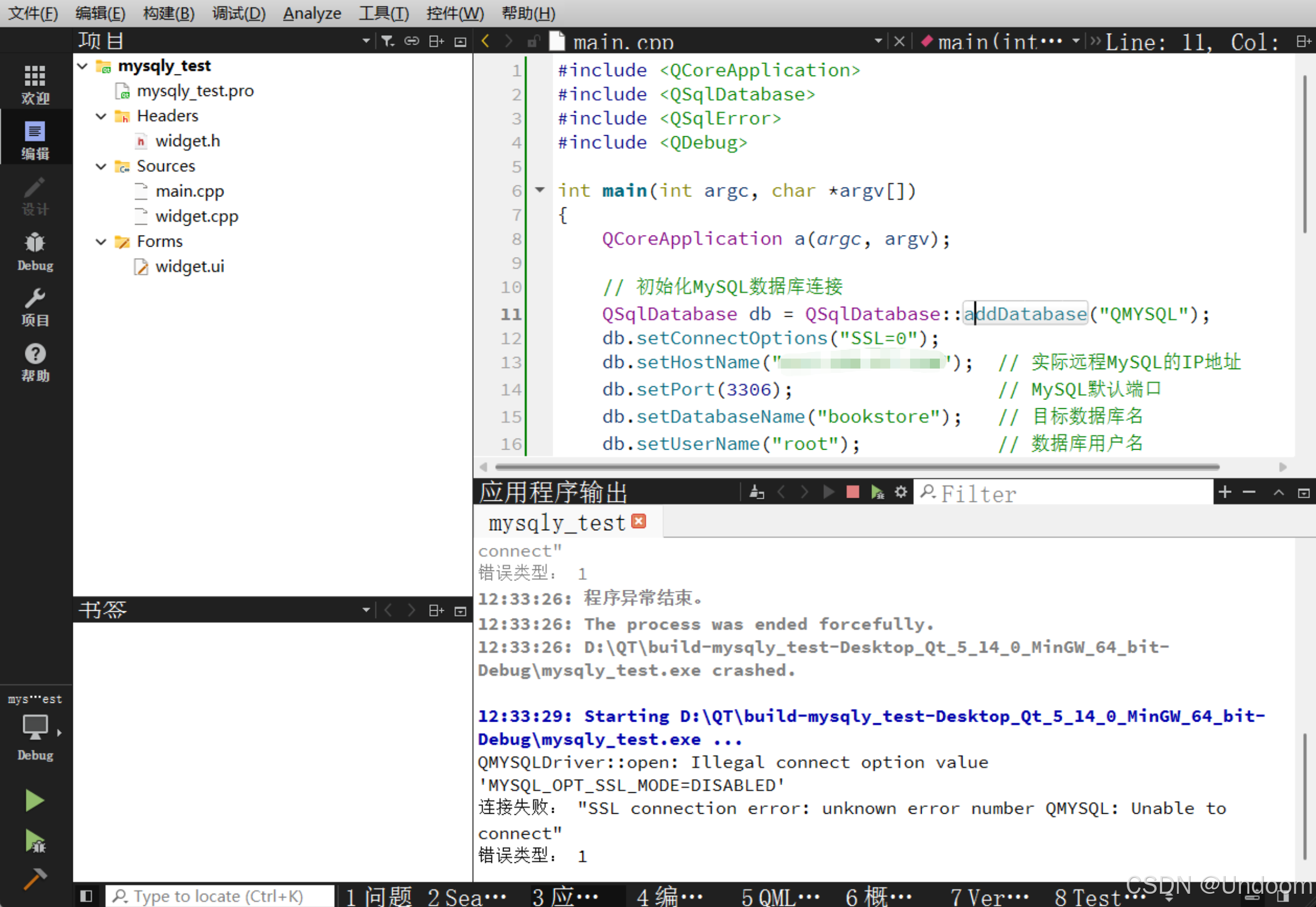 驱动验证通过后,即可编写代码连接远程 MySQL 服务器。连接过程主要涉及 QSqlDatabase 类的参数配置,包括主机地址、端口、数据库名、用户名和密码。