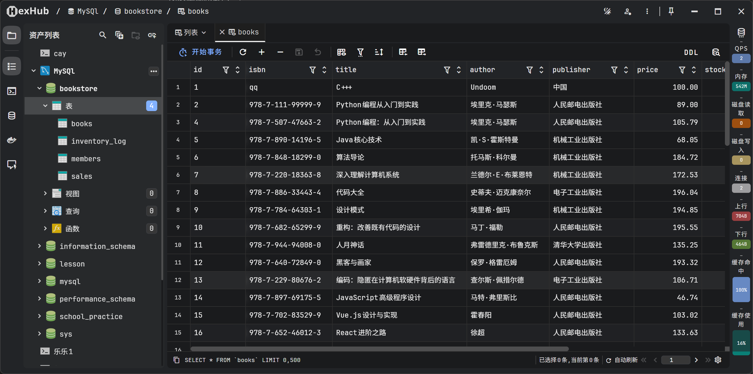 图 10:在 MySQL 数据库管理工具中查看到的 books 表数据,与 Qt 程序输出的结果完全一致,验证了连接和查询逻辑的正确性。
