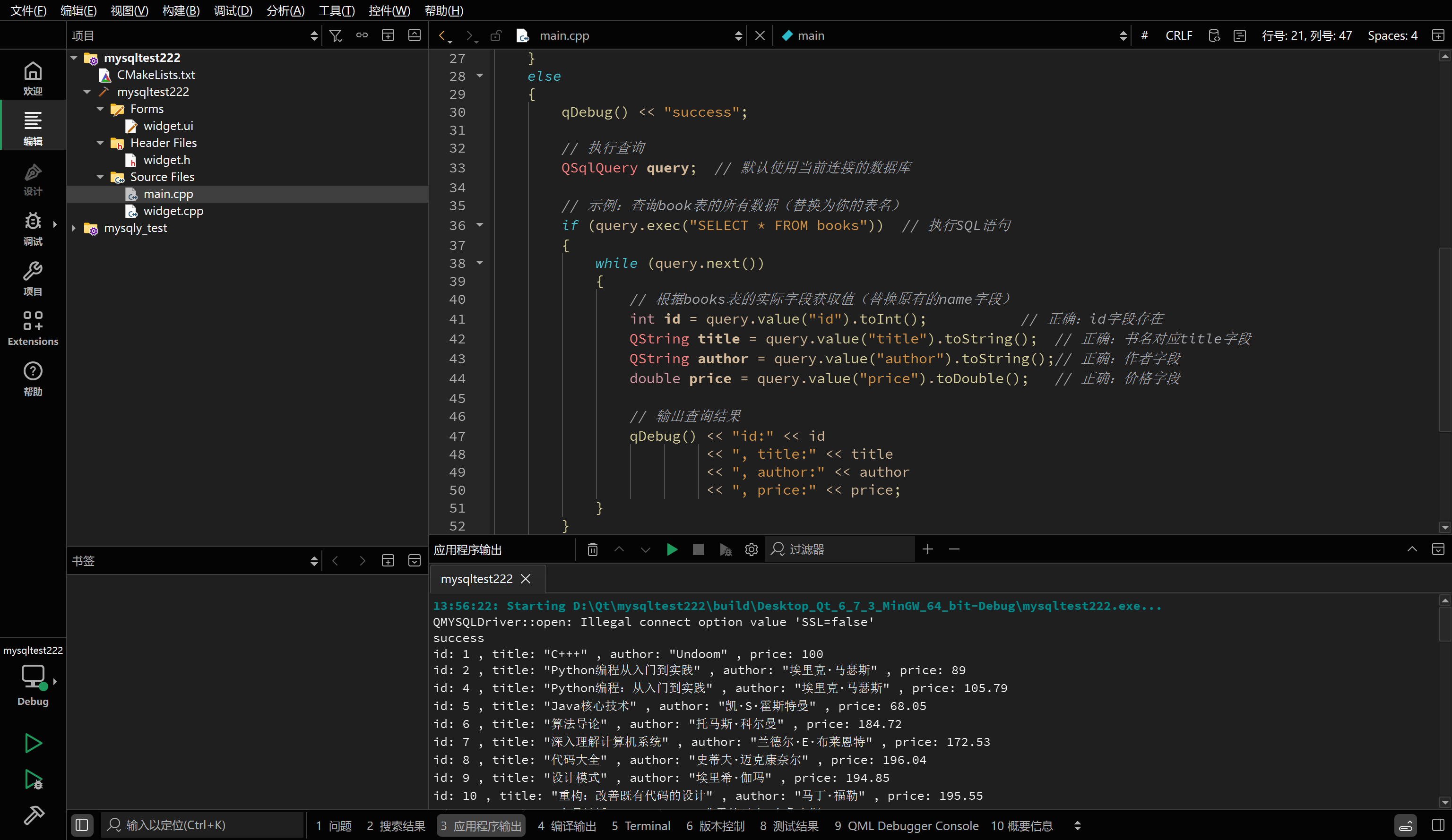 图 9:Qt Creator 控制台输出连接成功信息,并遍历显示了 books 表中的 id、title、author 和 price 字段数据。