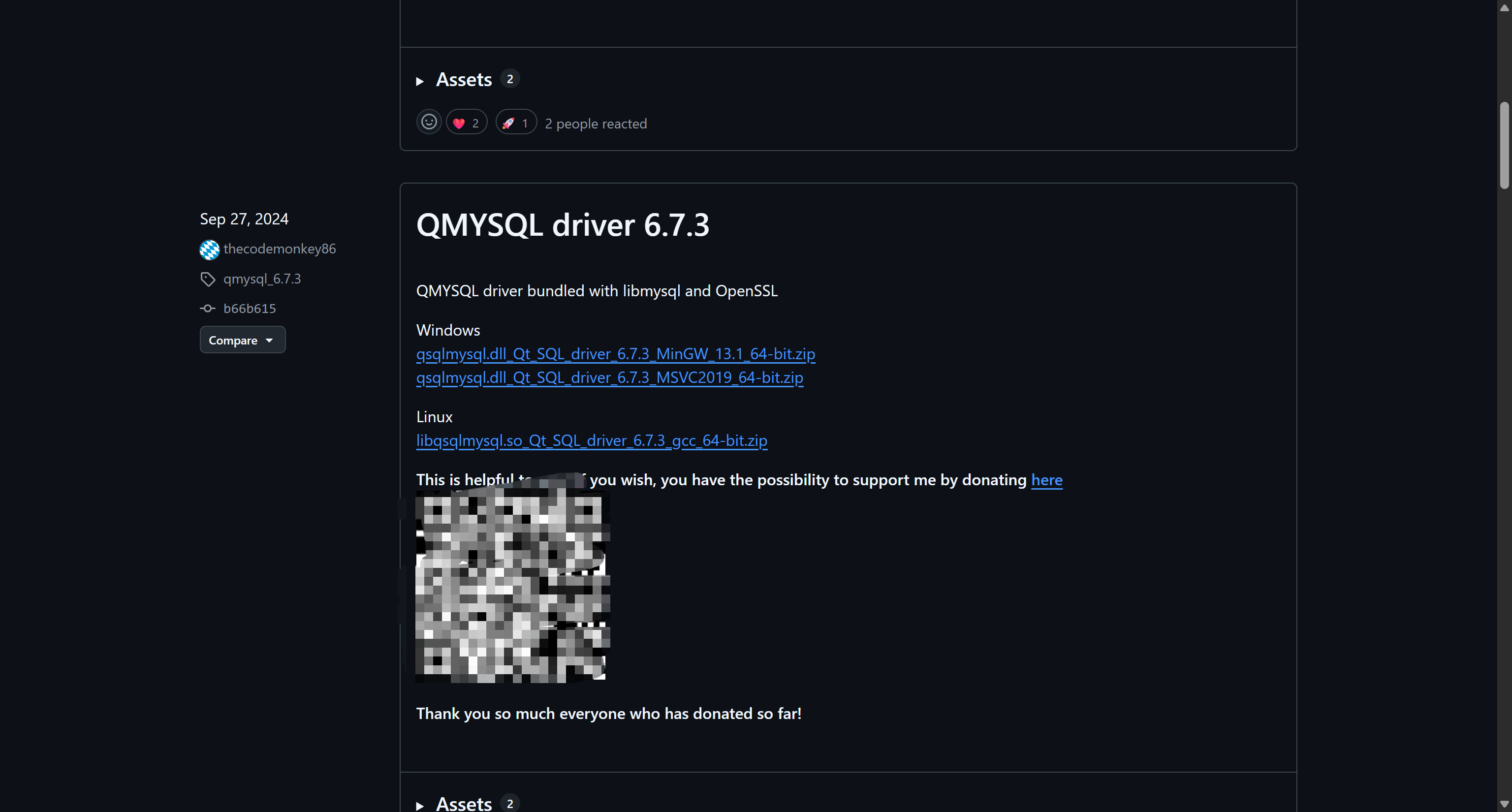 GitHub 上的 thecodemonkey86/qt_mysql_driver 仓库提供了针对不同 Qt 版本的预编译驱动。访问该仓库的 Release 页面,可以找到适配 Qt 6.7.3 的版本。