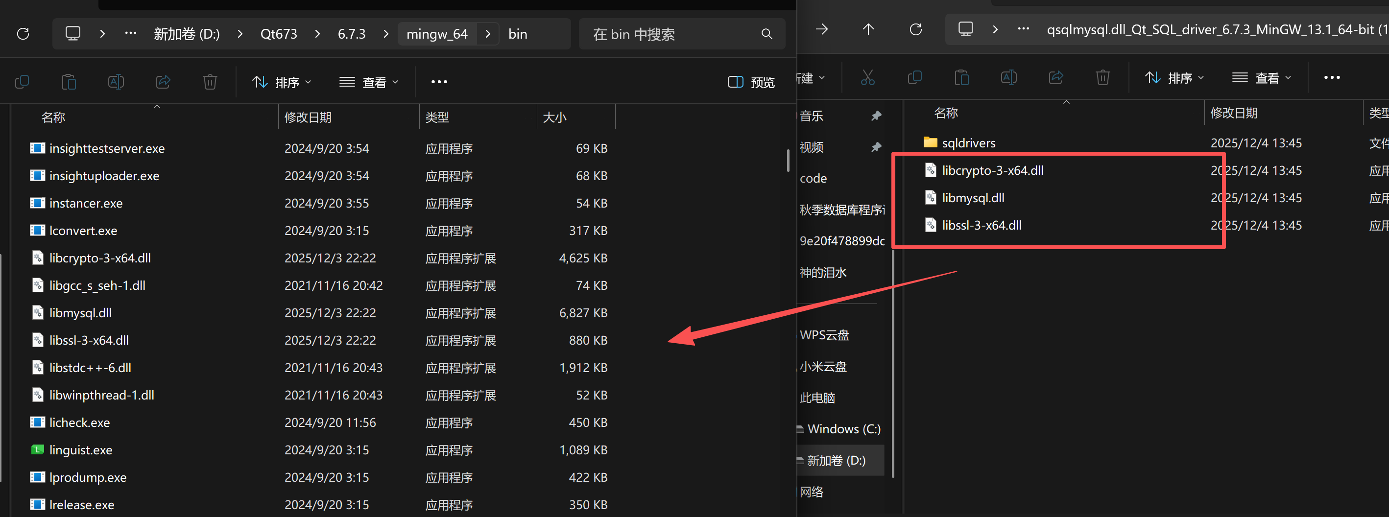 目标路径为 D:\Qt673\6.7.3\mingw_64\bin。将剩余的三个核心文件:libmysql.dll、libcrypto-3-x64.dll 以及 libssl-3-x64.dll 移动或复制到该目录下。
