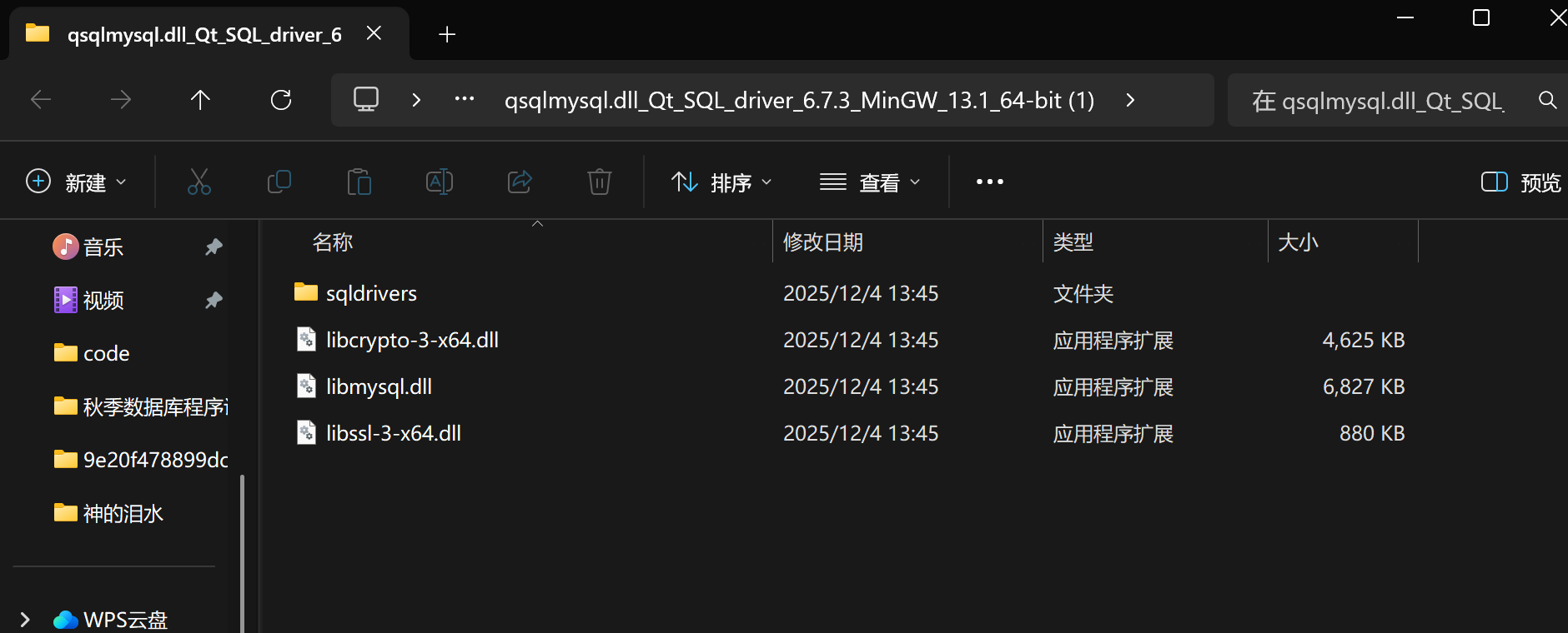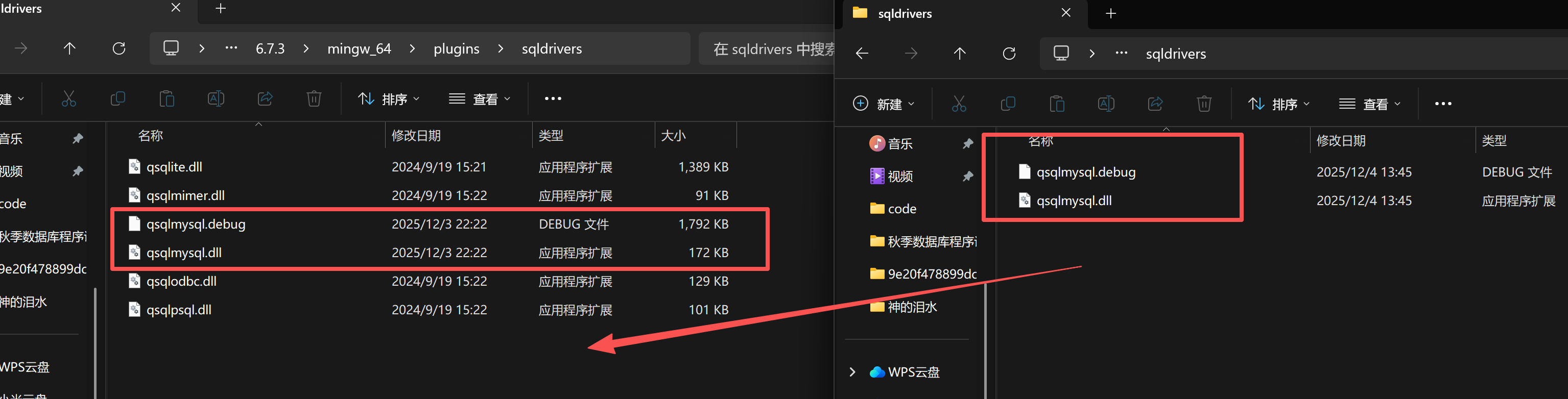 找到 Qt 6.7.3 MinGW 64位的安装路径,例如 D:\Qt673\6.7.3\mingw_64\plugins\sqldrivers。将解压包中的 qsqlmysql.dll 和对应的调试文件 qsqlmysql.debug 复制到此目录下。