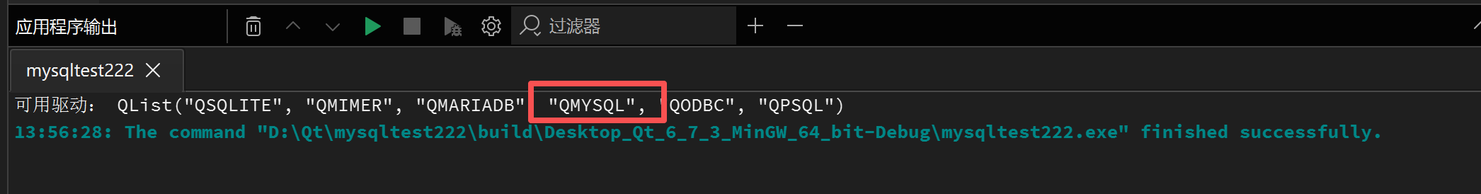 运行程序,观察"应用程序输出"窗口。如果配置正确,输出列表中应当包含字符串 "QMYSQL"。