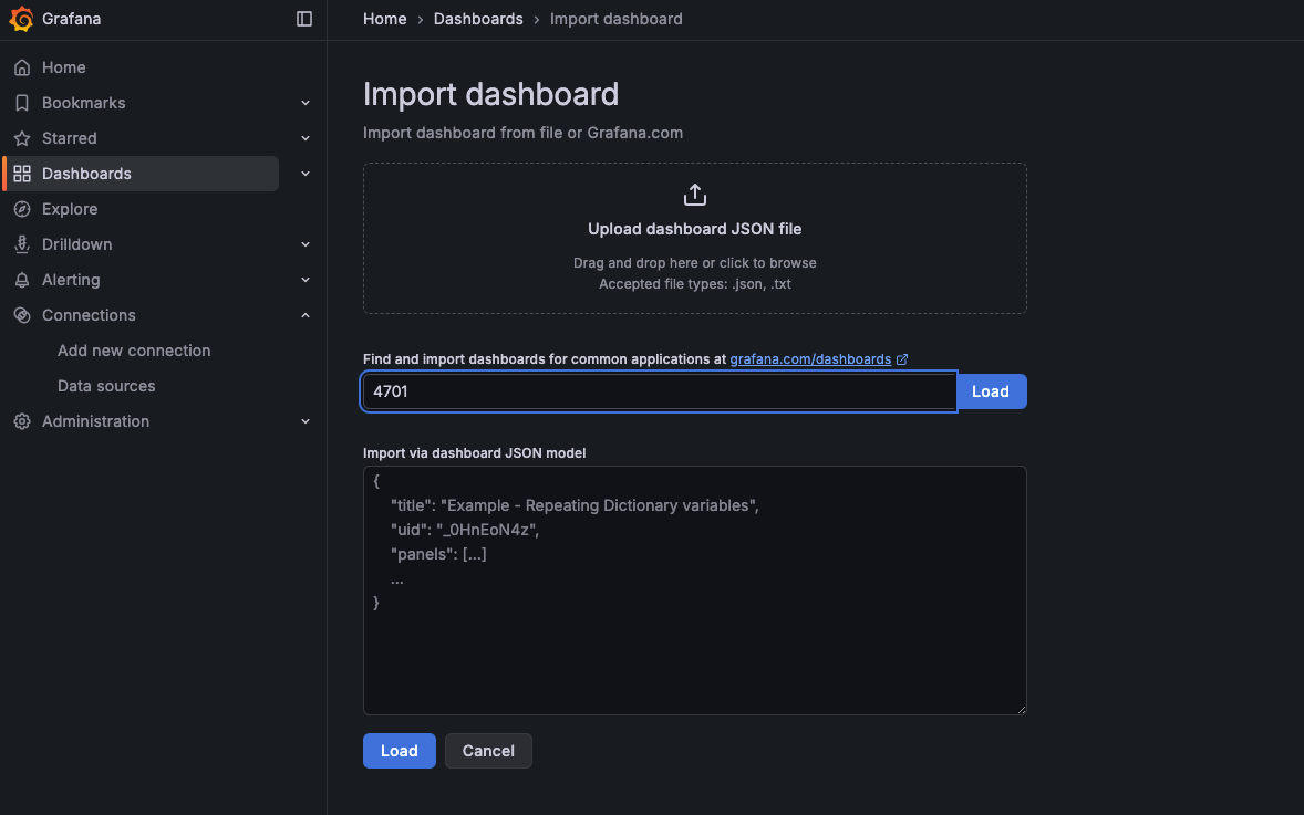 - 「Import via grafana.com」输入模板 ID:4701(Spring Boot 官方推荐模板),点击「Load」;
