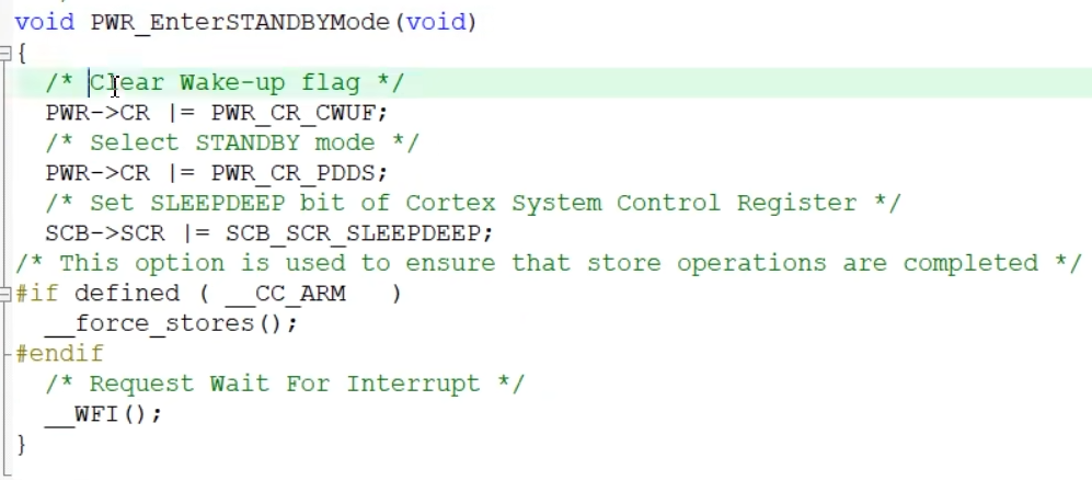 最后一步,调用WFI指令。进入待机模式。可以看到其实待机模式,并没有区分,WFI和WFE,库函数这里也不能选择。统一都调用的是WFI。这一部分也不难理解,WFI和WFE的区别就是唤醒方式的不同。