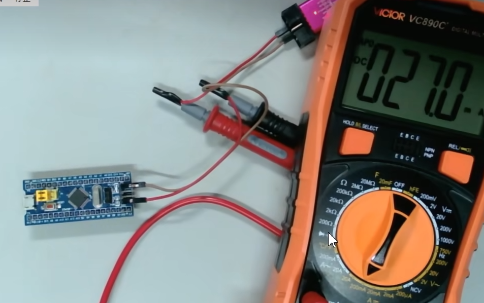 然后万用表放在200mA挡位,可以看到,这是正常工作的电流。目前是20多毫安,之后复位一下。