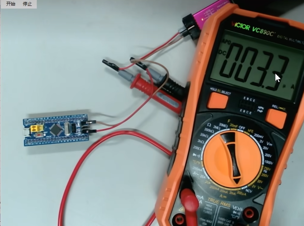 然后我们把挡位放在200uA档,可以看到目前待机的供电电流是3.3uA这就和手册上的数据基本吻合了。