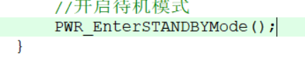 第二步选择STANDBY模式。实际上就是把PDDS置1。PDDS为1,表示进入待机模式。兄弟们一定要注意这里,如果你用的固件库是比较新的版本,里面可能会没有清除唤醒标志位的操作,这会导致你调用这个函数后只有第一次是运行正常的。