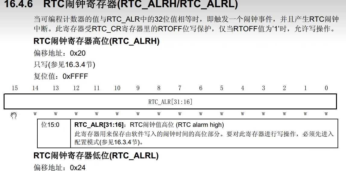 我们可以看一下手册的闹钟寄存器。有一排字母W,这就是对应位的读写特征。
