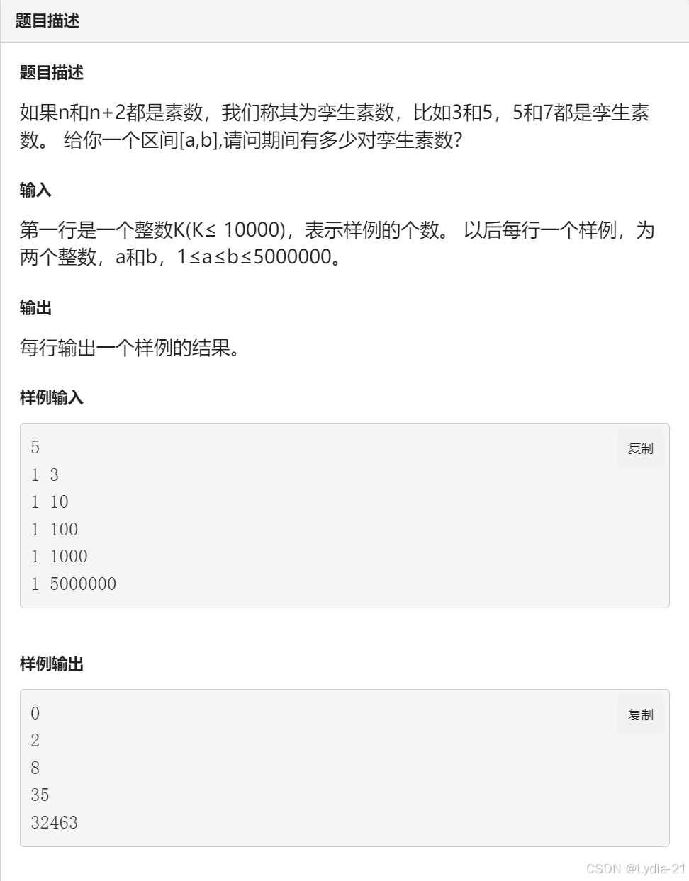 (x, x+2),因此统计的本质是找满足a ≤ x ≤ b-2且x和x+2都是素数的x的个数。