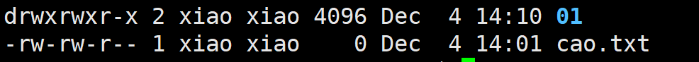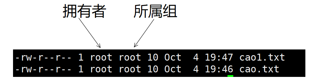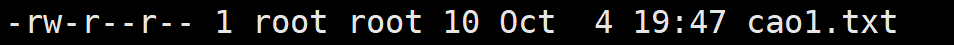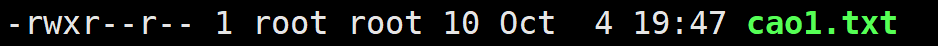 例如上图中cao1.txt的权限信息为:该文件的拥有者为root权限为读写不可执行,所属组为root权限为读不可写不可执行,other的权限为读不可写不可执行。