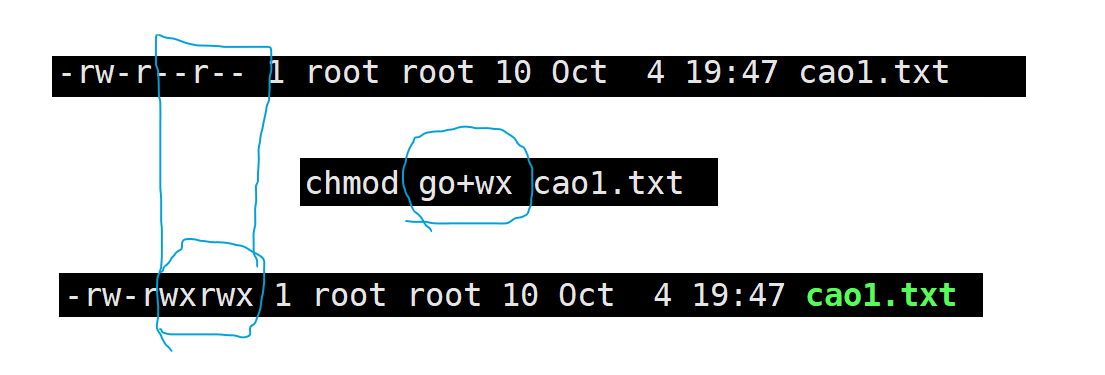 例如:在上述基础上执行:chmod go+wx cao1.txt 。如下图