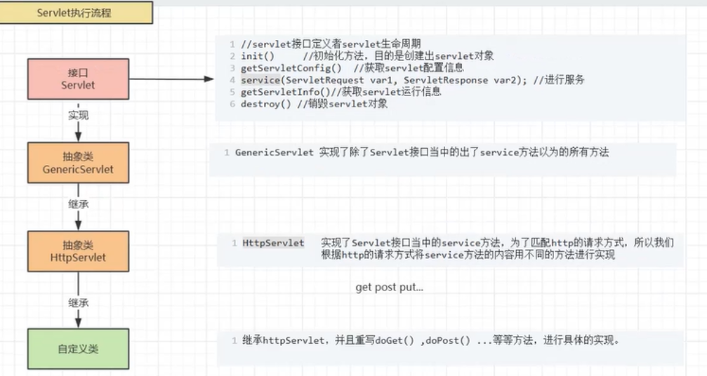 - `Servlet` 接口:定义了 Servlet 的生命周期方法(`init()`、`service()`、`destroy()` 等);
