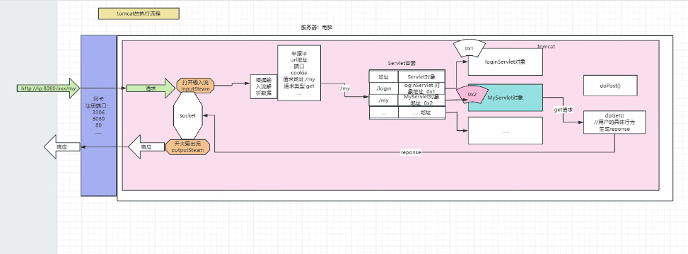 请求接收:当 HTTP 请求到达端口时,Tomcat 建立 Socket 连接,打开输入流读取请求数据;