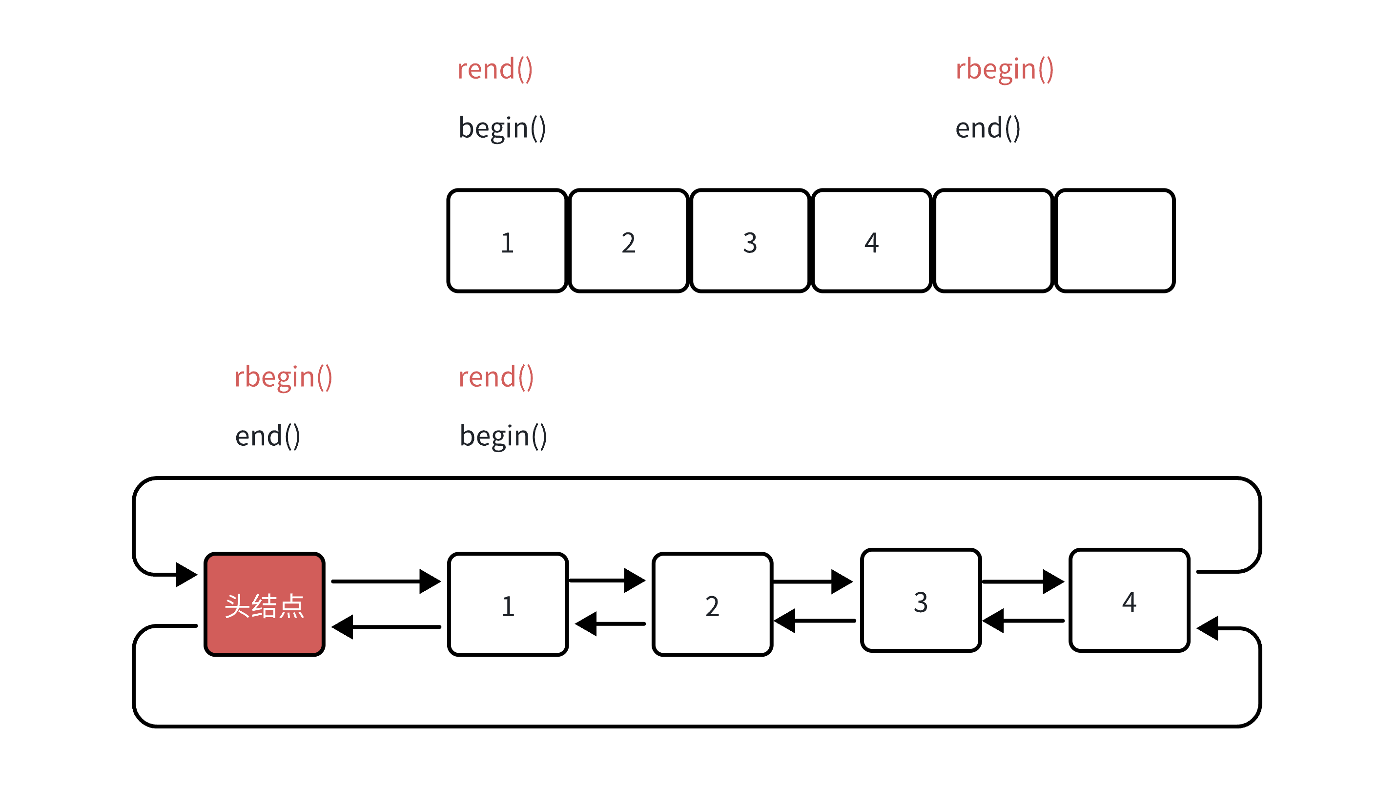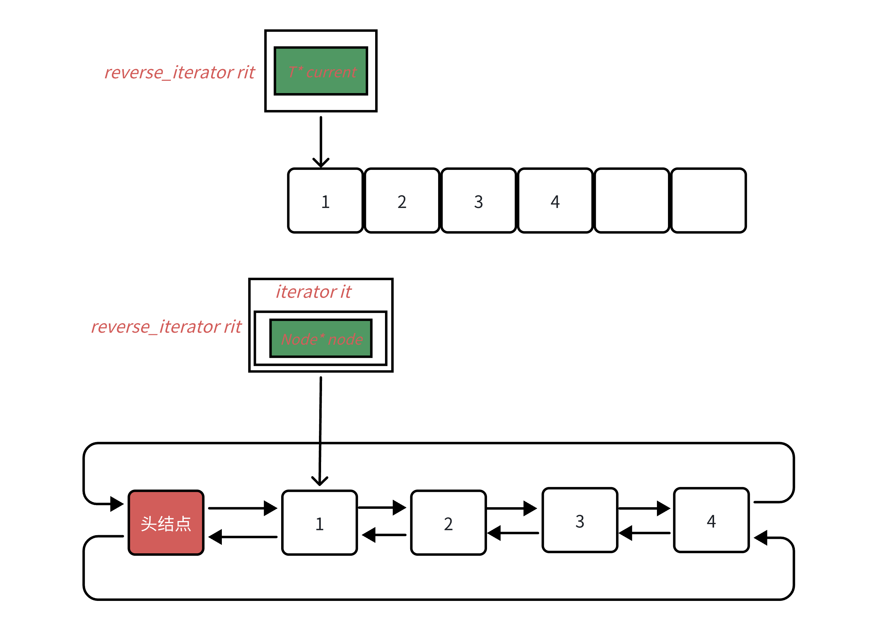 比较奇怪的是operator*的实现,内部访问的是迭代器当前位置的前一个位置。这个要结合容器中rbegin和rend实现才能看懂,rbegin返回的是封装end位置的反向迭代器,rend返回的是封装begin位置迭代器的反向迭代器,这里是为了实现出一个对称,所以解引用访问的是当前位置的前一个位置。
