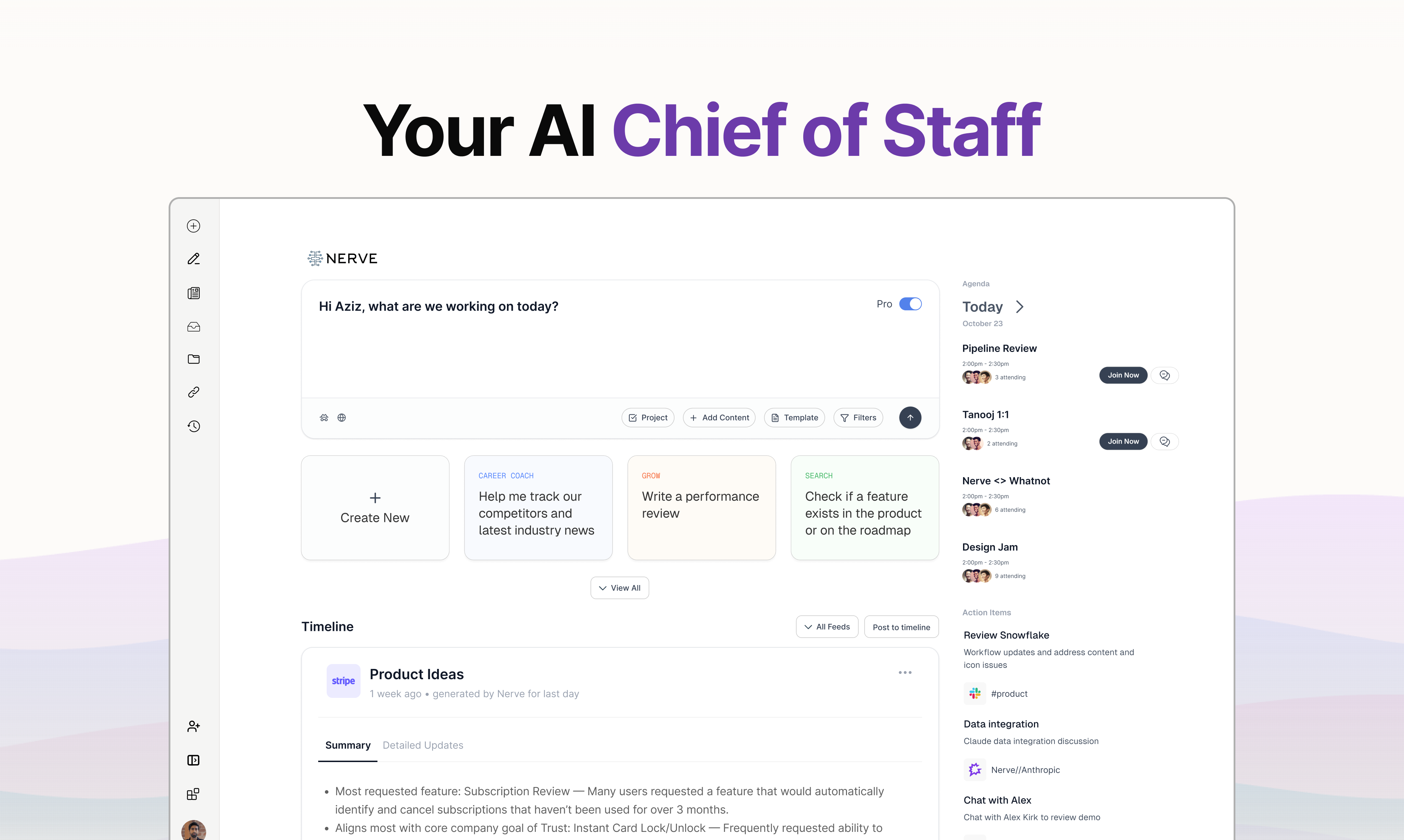 介绍:Nerve能够与您的团队已经使用的应用程序连接,深入搜索您内部的内容,并自动化您最常见的工作流程。它可以处理从撰写文档、更新客户关系管理系统(CRM)、在JIRA中创建工单,到回复电子邮件的各种任务。更棒的是,Nerve还会主动展示您最重要的待办事项和团队更新。Nerve已经为企业做好准备,符合SOC 2标准,支持SAML/SSO,并且绝不会在您的数据上进行训练。