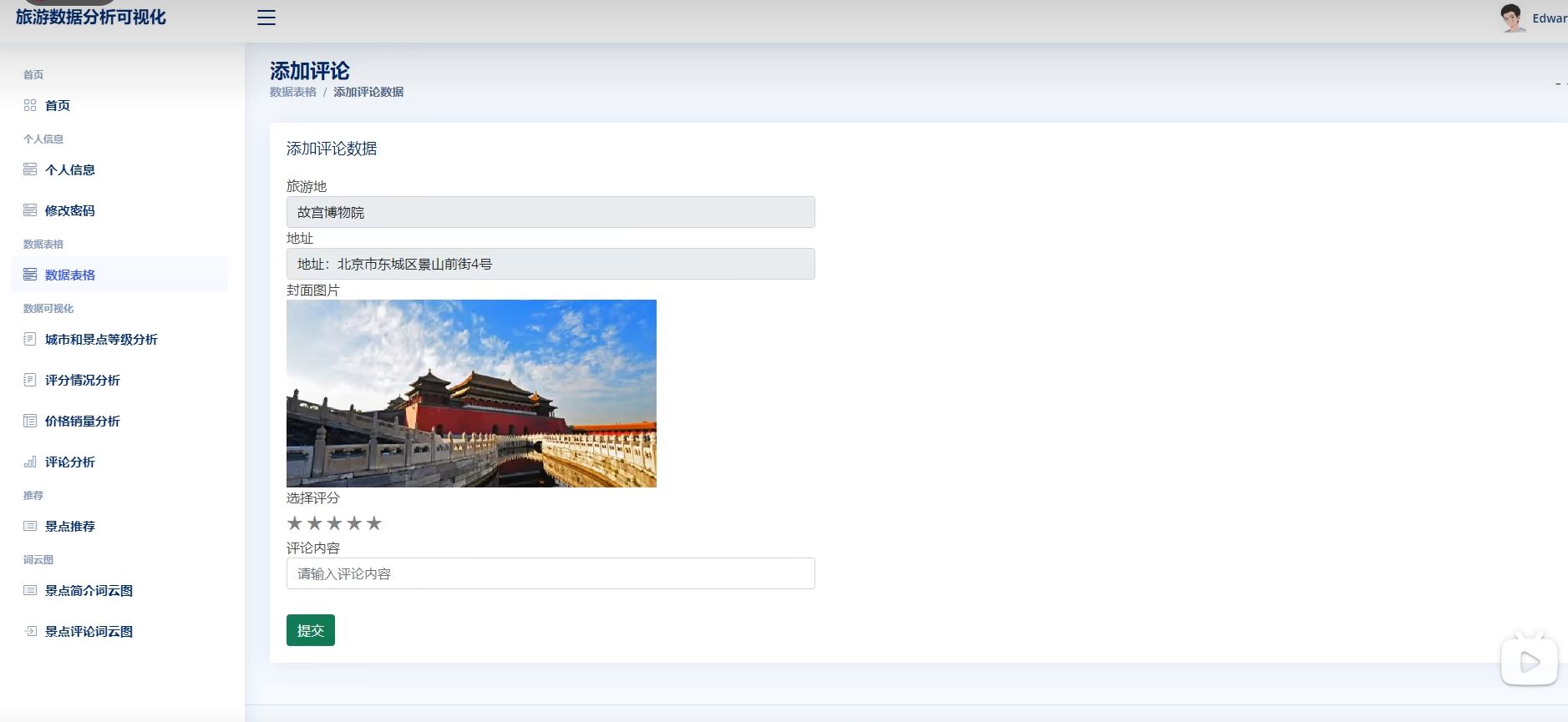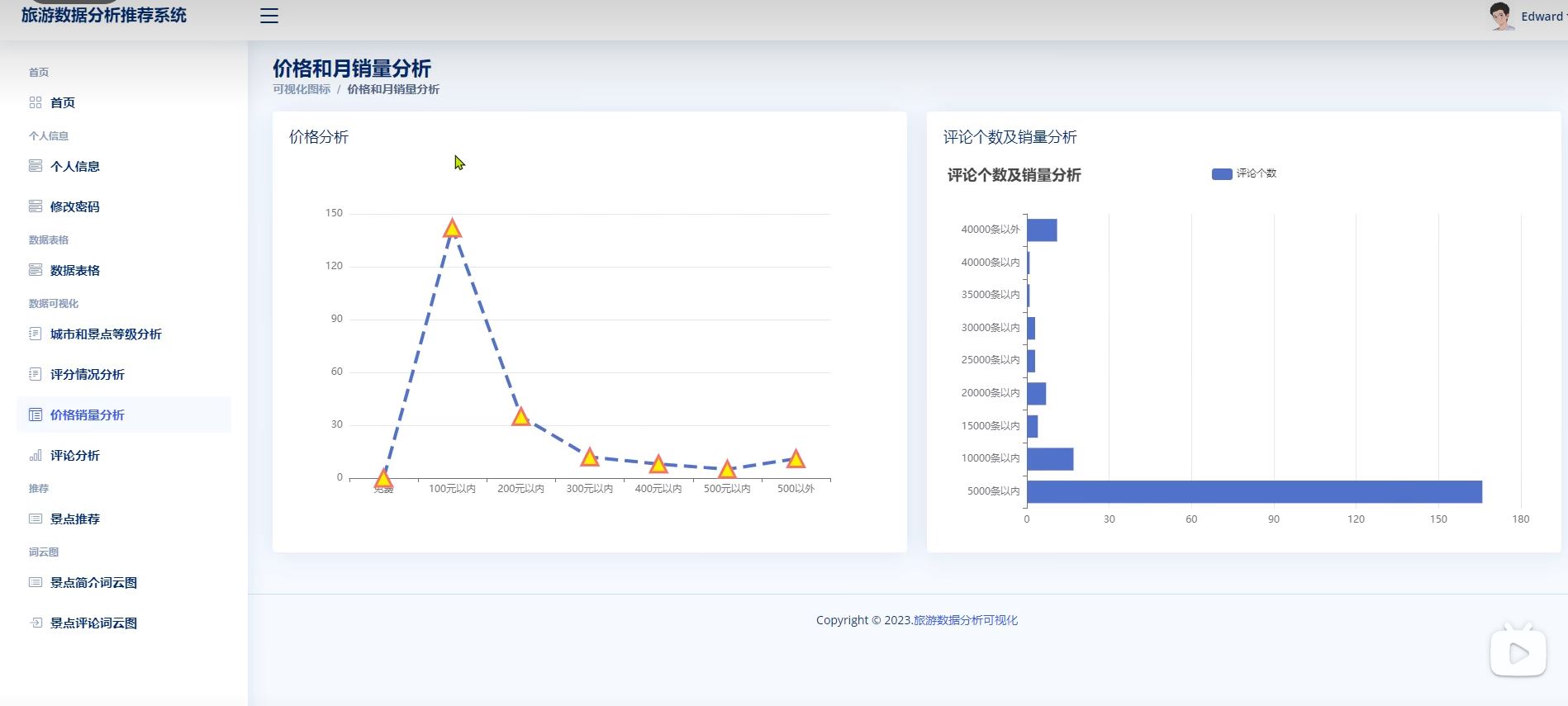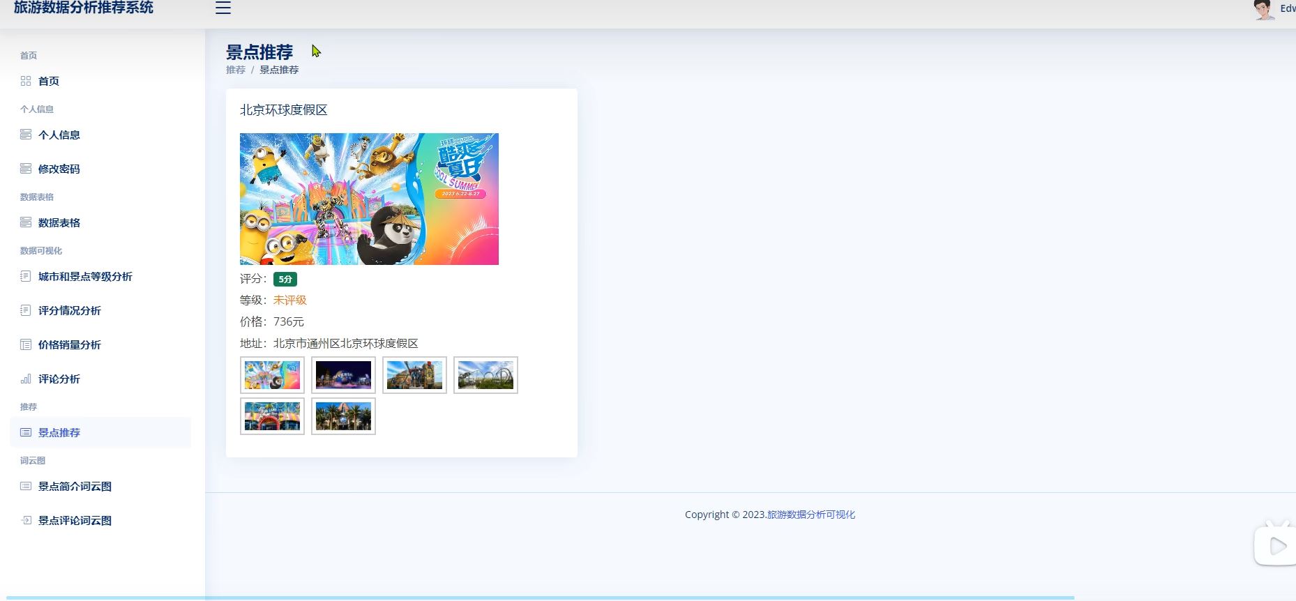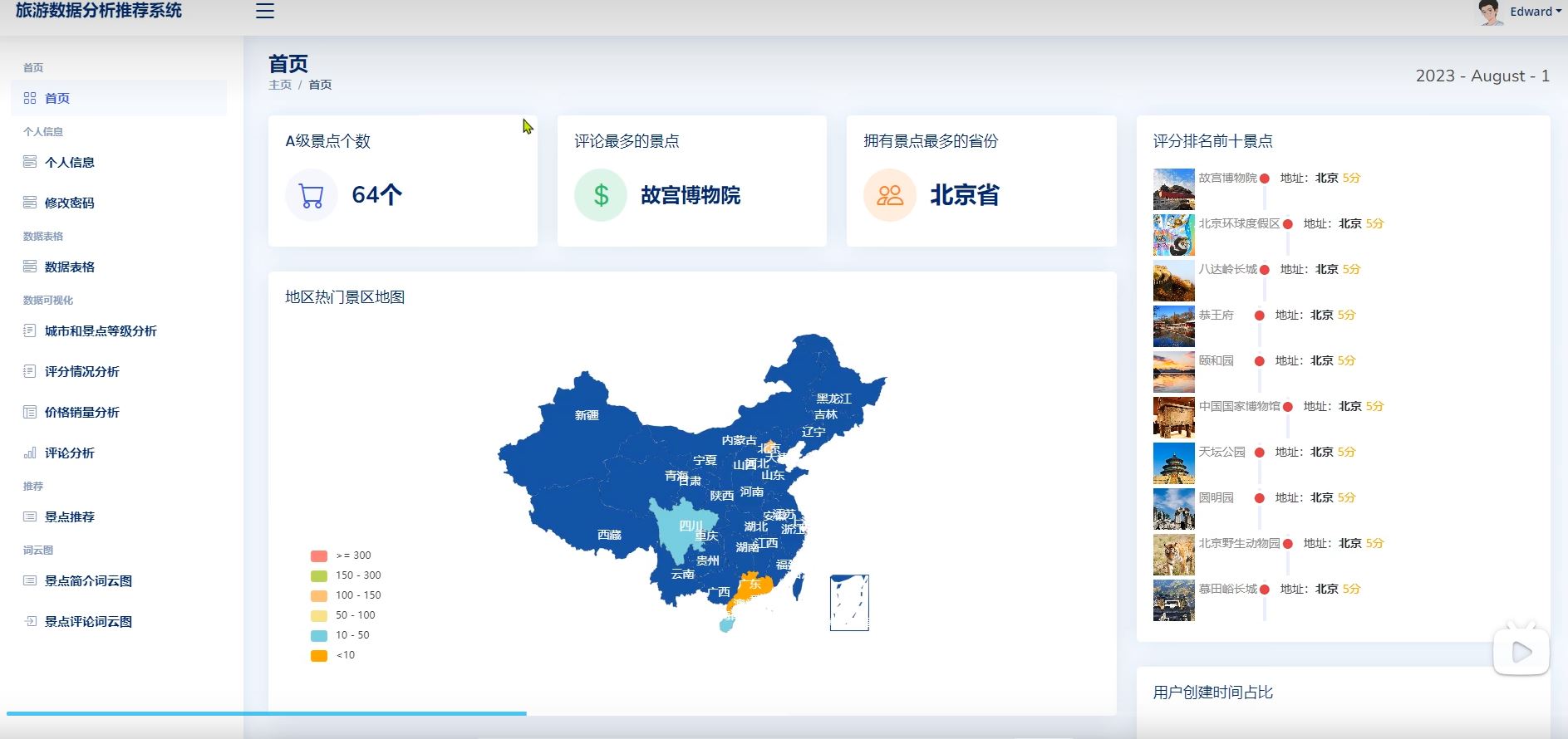 系统功能覆盖用户交互、数据管理、分析可视化与智能推荐四大模块,形成完整的旅游信息服务闭环。用户交互模块包含登录注册与个人信息修改功能,保障用户数据安全与个性化设置;主页地区热门景区地图通过地理空间可视化技术,直观展示不同地区热门景点的分布情况,帮助用户快速了解区域旅游热度;数据表格模块支持景点基础信息、用户评分、评论数据的查询与管理,为数据分析提供数据支撑;分析可视化模块涵盖城市和景点等级分析(统计不同城市景点等级分布、占比)、评分情况分析(展示用户评分分布、不同景点评分对比)、价格销量分析(挖掘价格区间与销量的关联规律)、评论分析(基于文本情感分析展示用户反馈倾向);智能推荐模块基于协同过滤算法,结合用户历史评分与偏好,为用户推送个性化景点;文本可视化模块包含景点简介词云图(提炼景点核心特色)与景点评论词云图(展示用户关注点),帮助用户快速把握景点亮点与口碑特征。整体功能设计兼顾了用户的信息获取需求与从业者的数据分析需求,实现了实用性与交互性的统一。