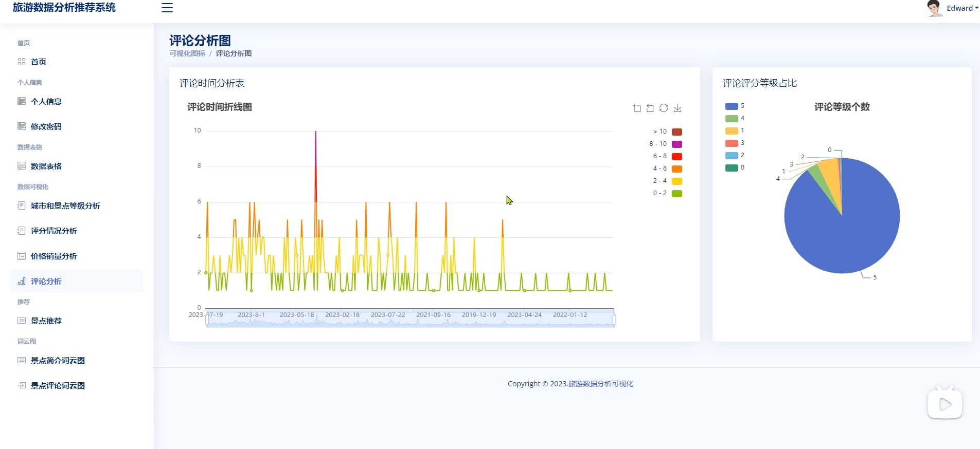 本项目兼具理论价值与实践意义。在实践层面,对普通用户而言,系统通过个性化景点推荐、直观的数据分析图表,帮助用户快速制定旅游计划,提升旅游决策效率;对旅游行业从业者而言,系统提供的城市景点等级分析、价格销量关联分析等功能,能够辅助其把握市场需求变化,优化产品布局。在理论层面,项目丰富了协同过滤算法在垂直领域(旅游)的应用案例,验证了机器学习技术与 Web 开发技术结合的可行性;同时,将多维度数据可视化(如地理空间可视化、文本词云可视化)融入旅游分析,拓展了旅游数据挖掘的呈现形式,为智慧旅游系统的研究提供了新的视角。此外,系统的模块化设计与技术栈选型,也为中小型旅游信息系统的开发提供了可复用的技术框架,具有一定的推广价值。