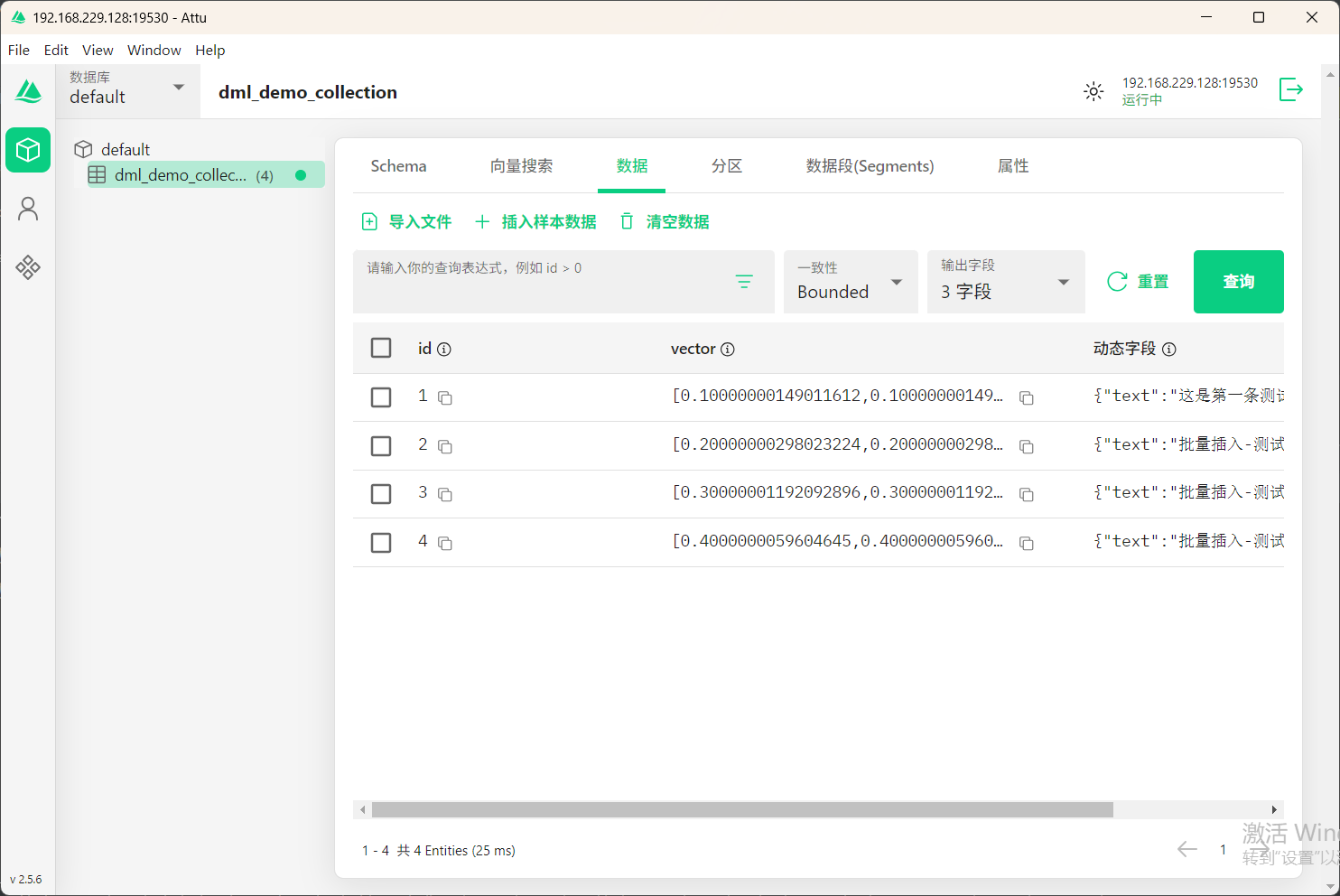dml_demo_collection集合,点击"Load"(加载到内存); - 点击"Browse Data",即可看到所有插入的数据(包括预定义字段和动态字段)。