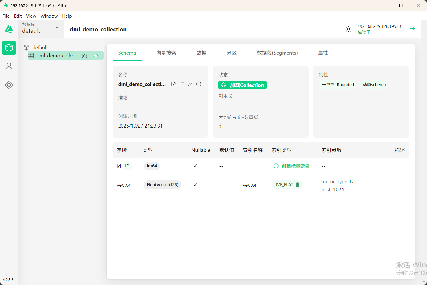 auto_id=True时,Milvus会自动生成唯一主键(INT64类型),无需手动指定,避免主键冲突; - 数据加载:无论是Attu可视化操作还是Python查询/删除,都需先将集合"加载到内存"(load),否则无法执行核心操作。