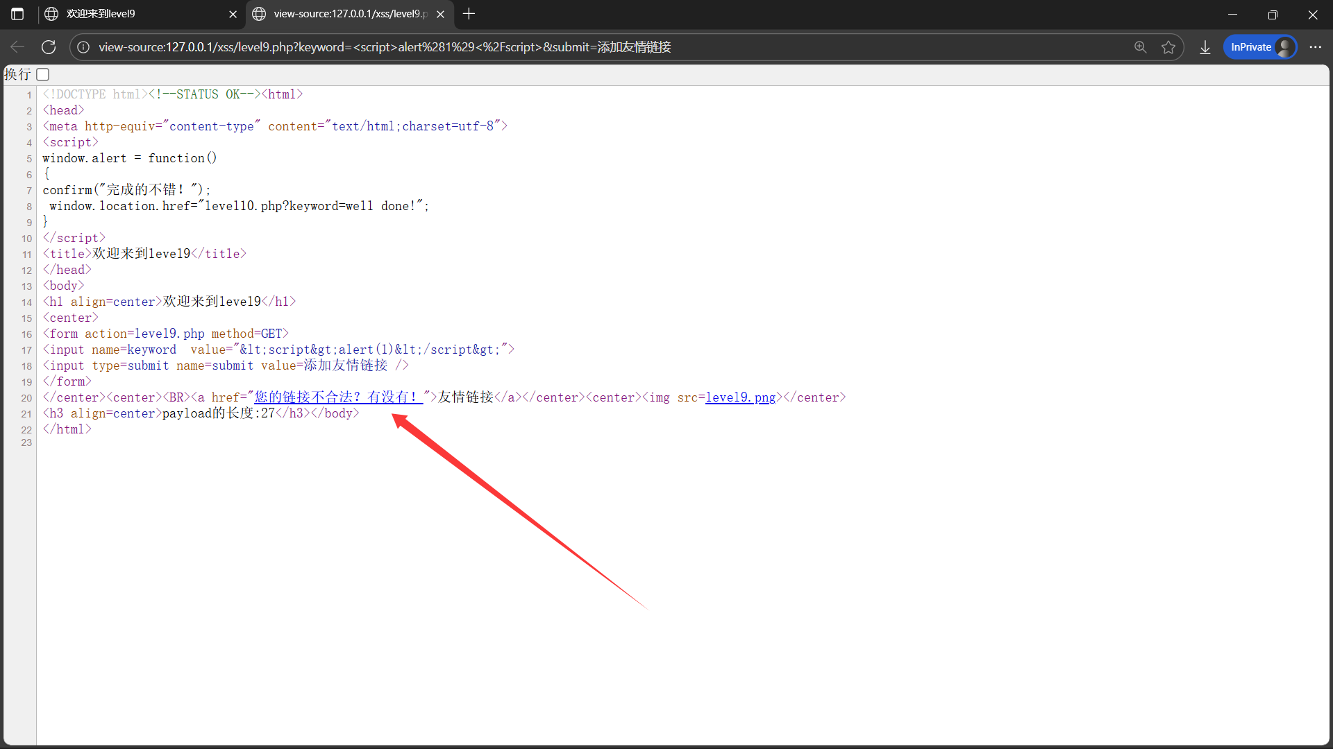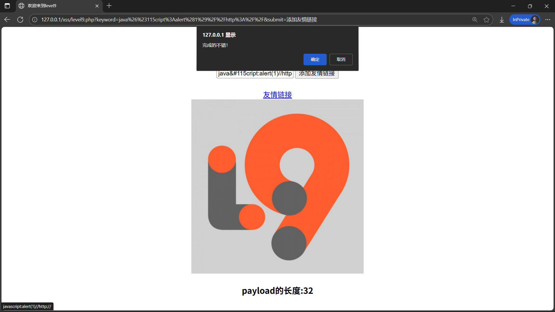 进入第9关,输入<script>alert(1)</script>显示链接不合法