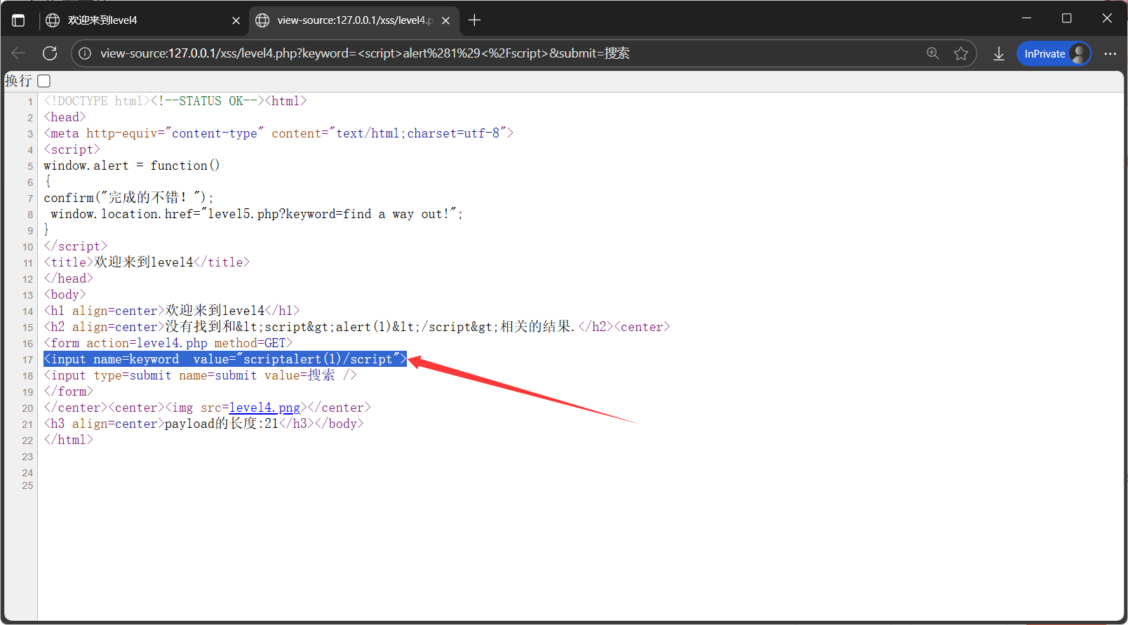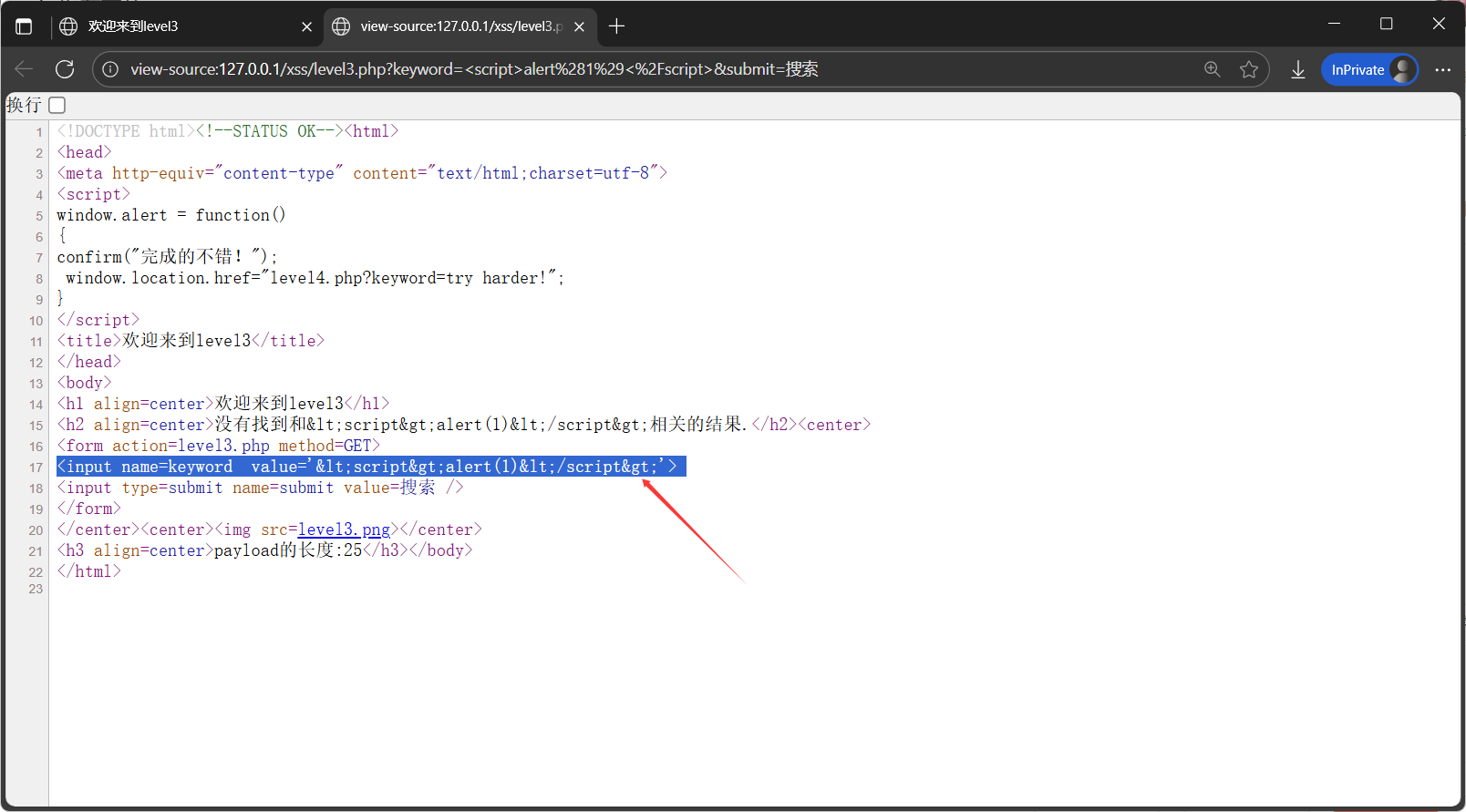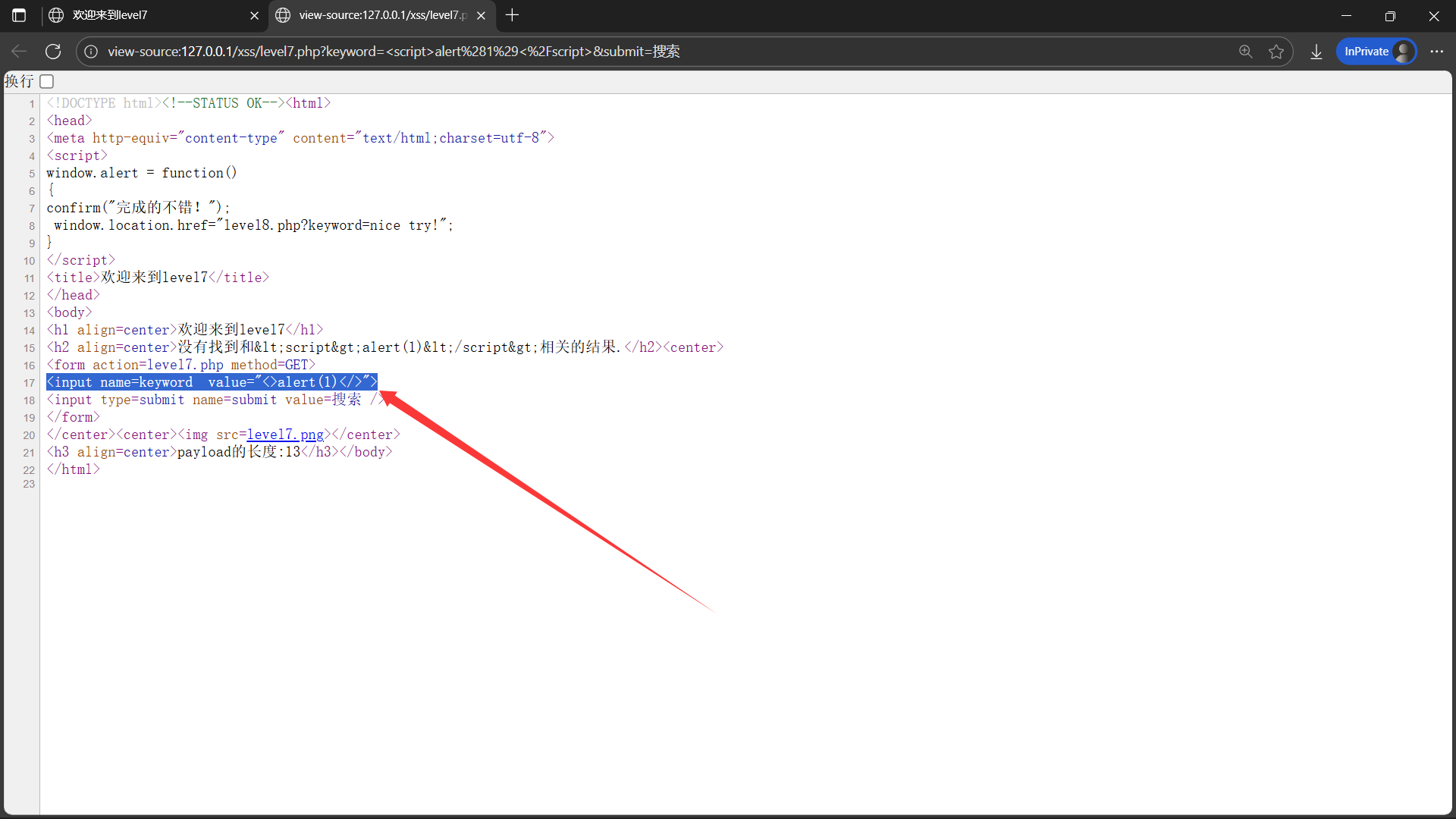 | Level 7 | 重复关键词会被删掉一次,可用嵌套绕过 | "><sc<script>ript>alert(1)</sc<script>ript> |