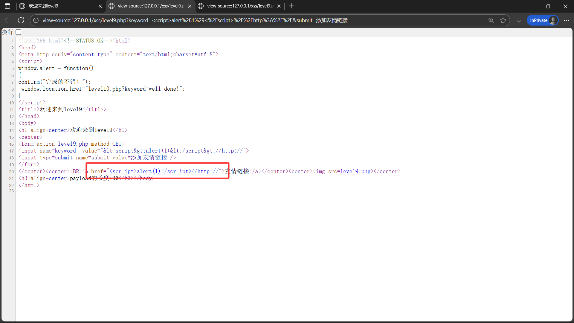 | Level 9 | 必须包含 http://才输出,过滤 script |