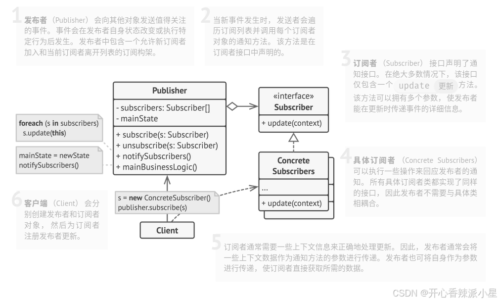 - ConcreteSubject(具体主题):实现具体的主题对象,状态变化时通知所有注册的观察者。