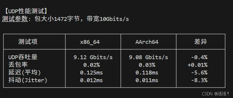 | UDP吞吐 | 9.12 Gbits/s | 9.08 Gbits/s | -0.40% |