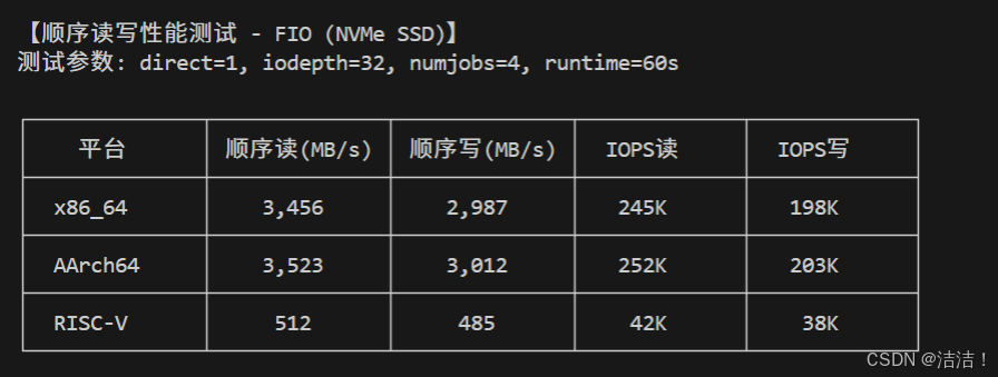 本节使用FIO工具进行标准化磁盘I/O测试,评估openEuler在不同架构下的存储性能: