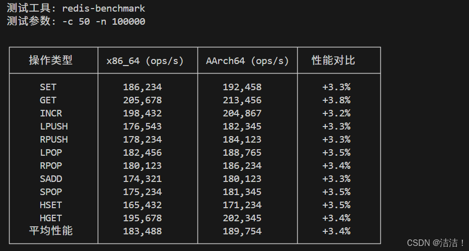 | 操作类型 | x86_64 (ops/s) | AArch64 (ops/s) | 性能对比 |