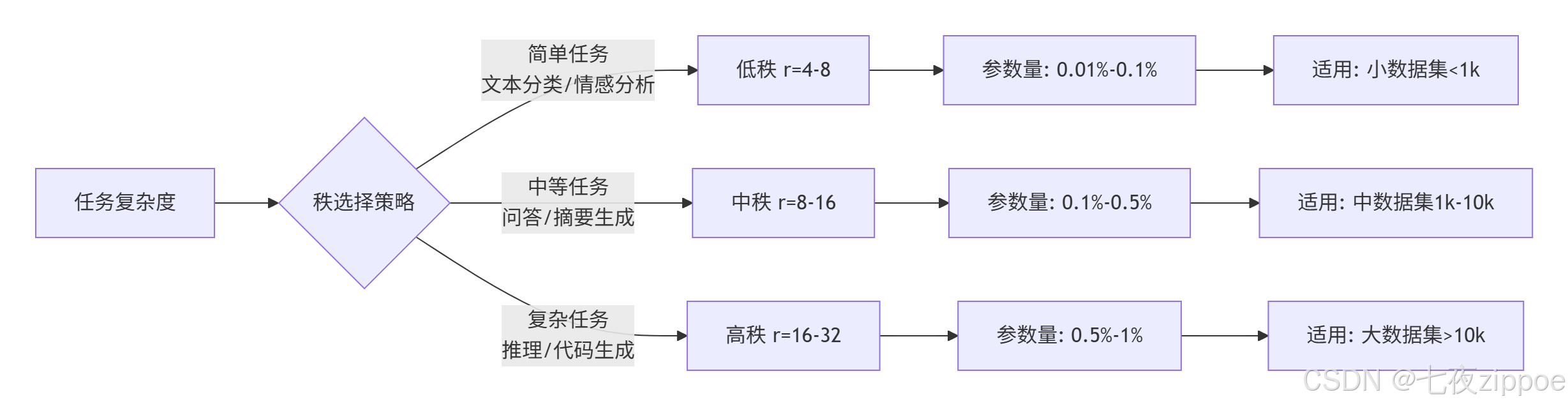 秩(rank)的选择是LoRA效果的关键。过小的r(如2-4)可能欠拟合,无法捕捉任务复杂性;过大的r(如64+)则接近全量微调,失去参数效率优势。经验表明,r=8-16在大多数任务上能达到最佳平衡。