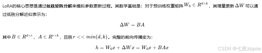 模型冻结:保持原始预训练权重W0不变,仅计算梯度但不更新