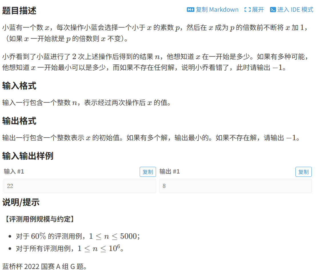 核心思路是反向推导+素因数限定范围+最小化验证,首先明确选小于当前数的素数p,补到p的倍数的操作逻辑,反向来看,若操作结果是res,则操作前的数需在(res-p, res]之间(且p是res的素因数、p小于操作前的数)。解题时,先从最终结果n出发,找出n的所有素因数(作为第二次操作的候选素数p1),据此确定第二次操作前数y的合法范围(需满足y>p1且y∈(n-p1, n]),遍历这些y并验证其选p1操作后是否得到n;再对每个合法的y,找出y的所有素因数(作为第一次操作的候选素数p2),确定第一次操作前数x的合法范围(需满足x>p2且x∈(y-p2, y]),遍历x验证其选p2操作后是否得到y,过程中记录最小的x;最终若找到最小x则输出,无合法值则输出-1。代码如下: