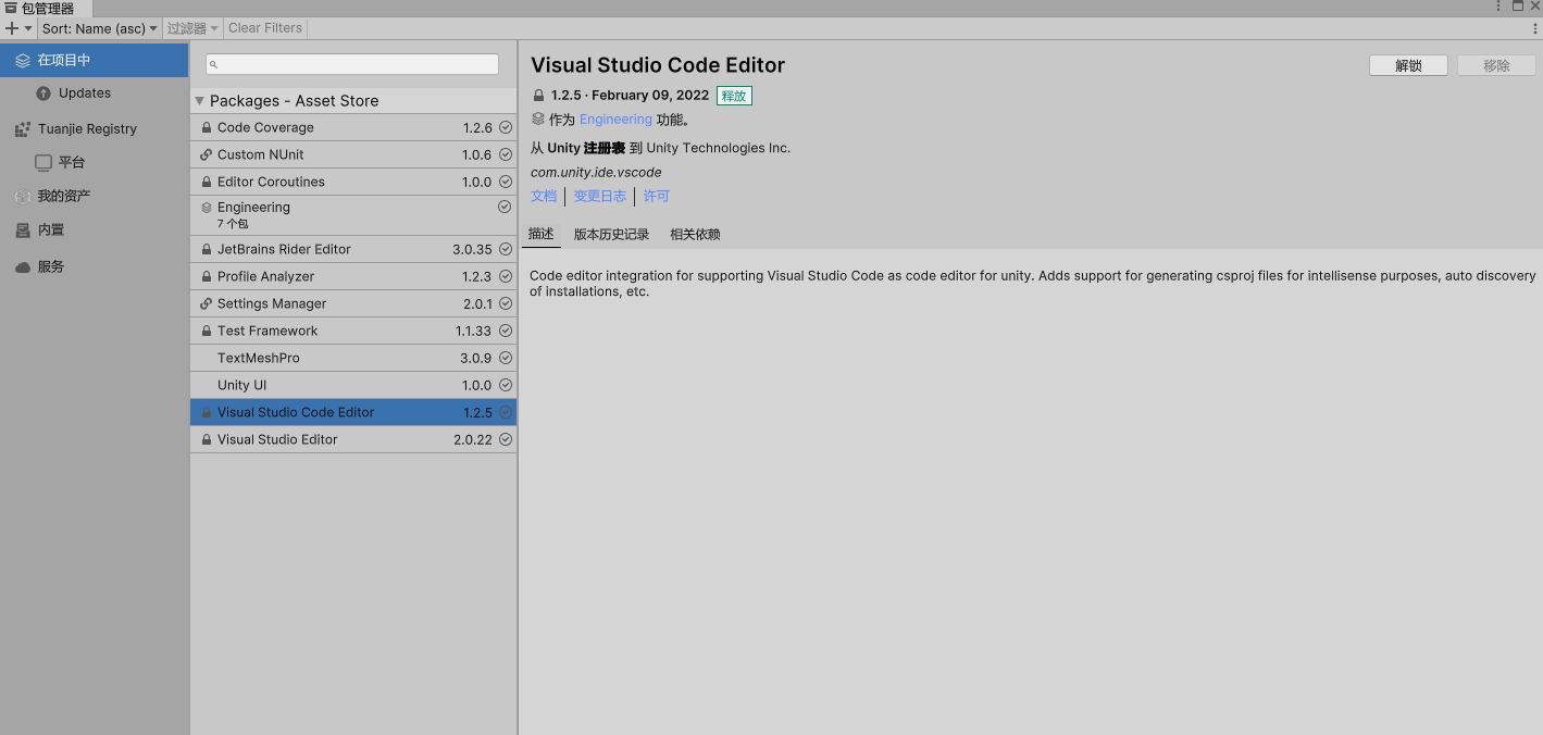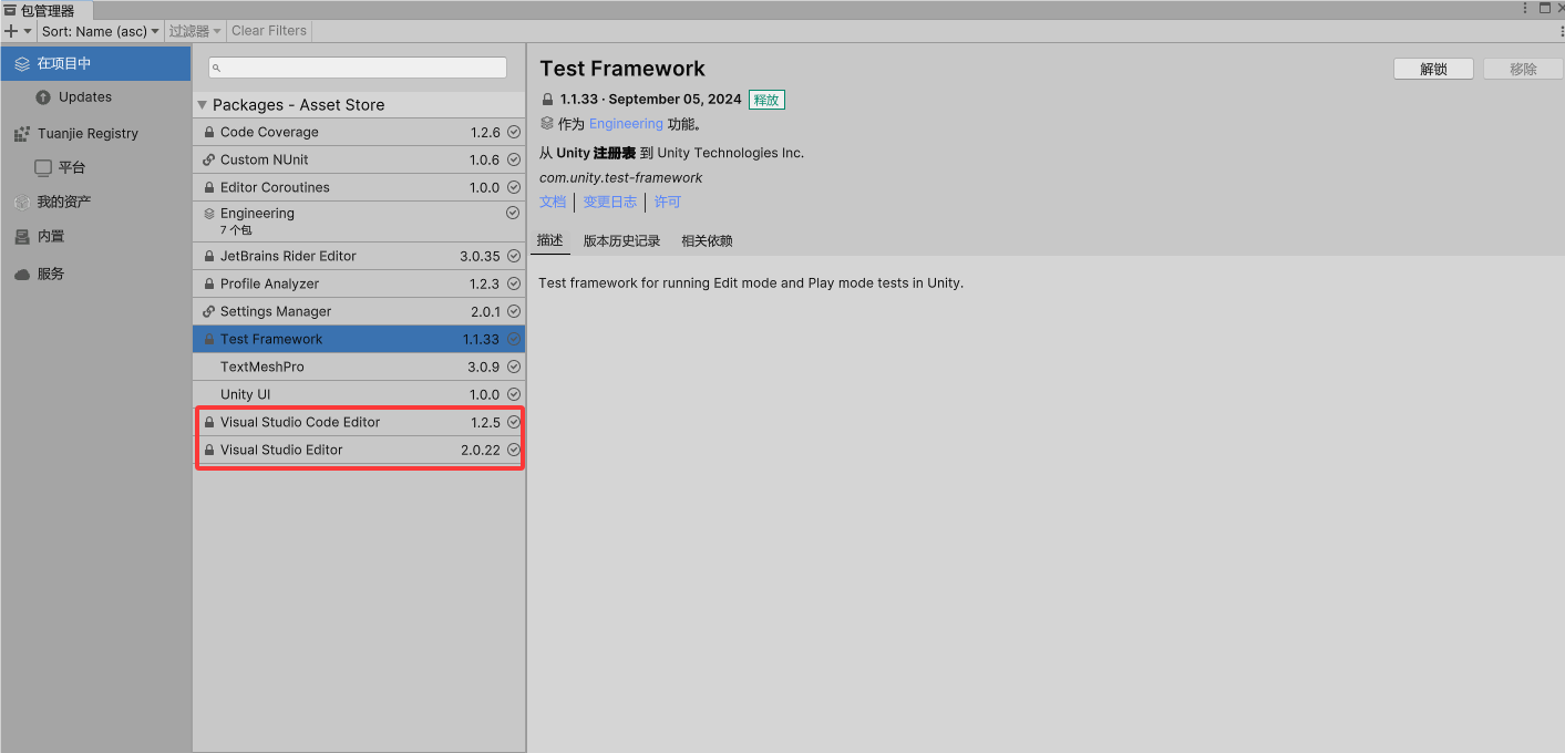 - Unity 2022 版本以前:须手动补充安装 Visual Studio(code)Editor
