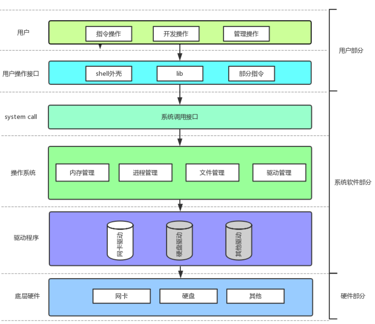 - 操作系统内核四大功能:进程管理、文件管理、存储管理和驱动管理。能够发现,操作系统干的事情就是管理。
