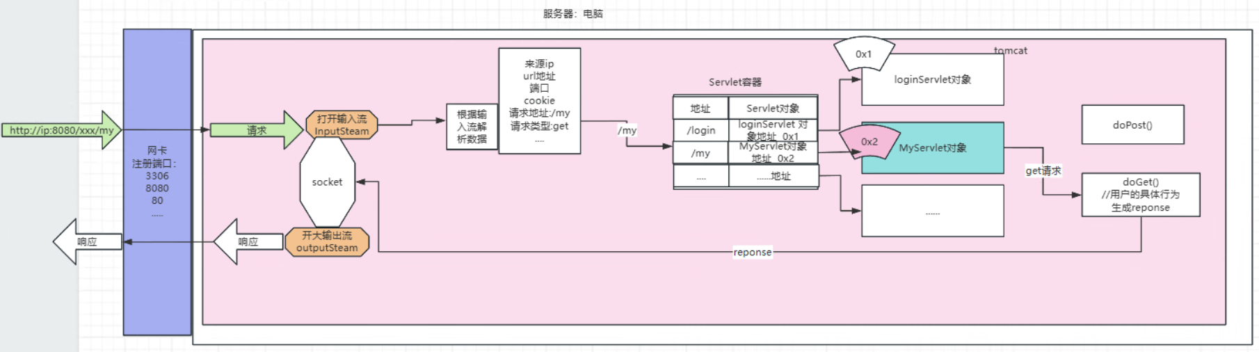 注册完端口请求就会发送给Socket,Socket的作用就是实现设备间的网络通信 ,所以这是Socket要打开输入流 InputStream,根据输入流解析 其中的数据(比如来源,请求地址,请求类型等信息,这些信息一般都位于"请求头"),得到请求地址和请求类型之后,把地址发送给Servlet容器(这里的地址以/my为例)。