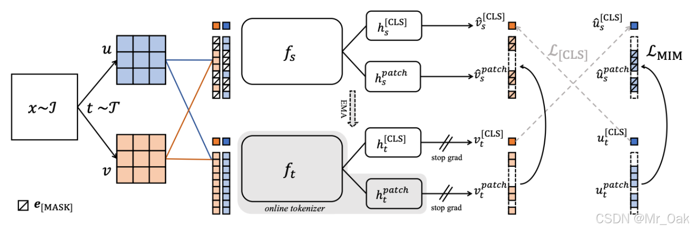 第四步:student接收mask之后的图像块,学习局部与全局的关联性,teacher接受完整的图像块,这里teacher用的是online tokenizer(这个是实时的,不同与BERT的预训练,这部分是实时训练的,用的是vit架构)
