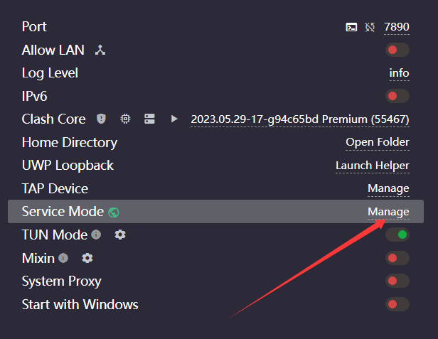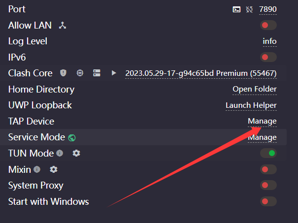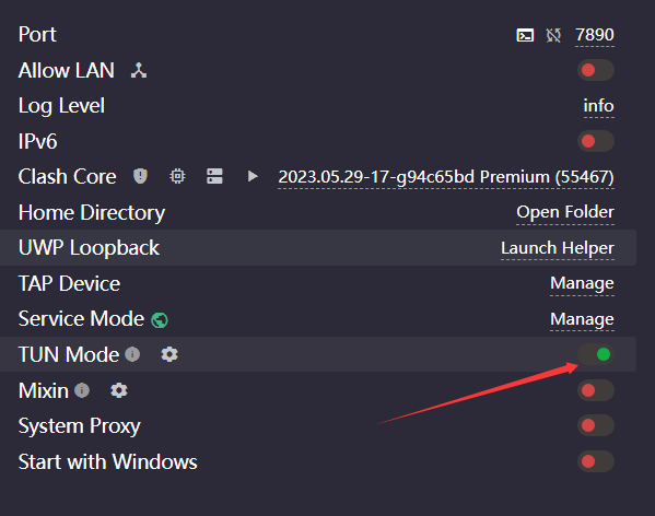 首先,请确保您的网络环境优化工具中已启用**"Tun 模式"** 或 "服务模式"(即全局接管流量的模式)。
