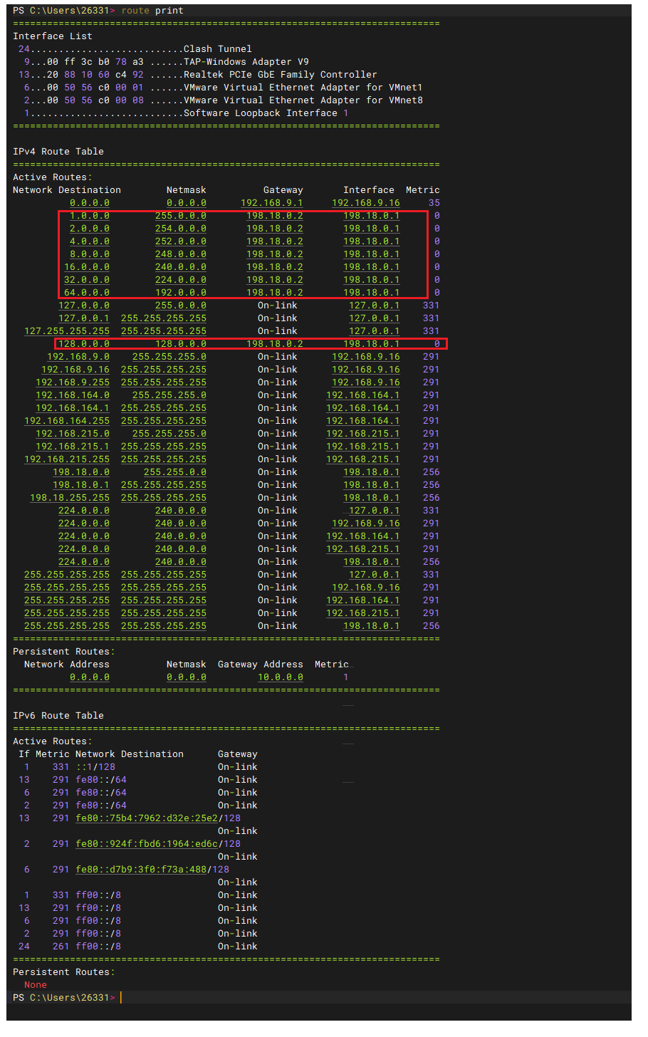 关键检查: 在 IPv4 路由表中,确认存在指向您的虚拟网卡 IP 接口的路由条目。这确保了待优化流量能够通过正确的路径进行传输。