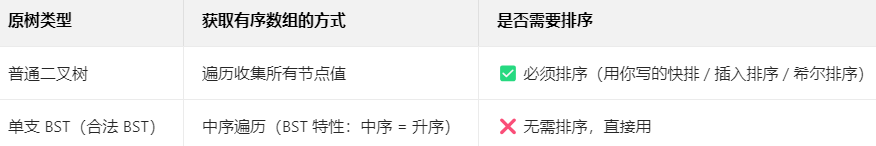 核心步骤1. 遍历普通树提取所有节点值;2. 排序得到升序序列;3. 分治法构建平衡 BST。