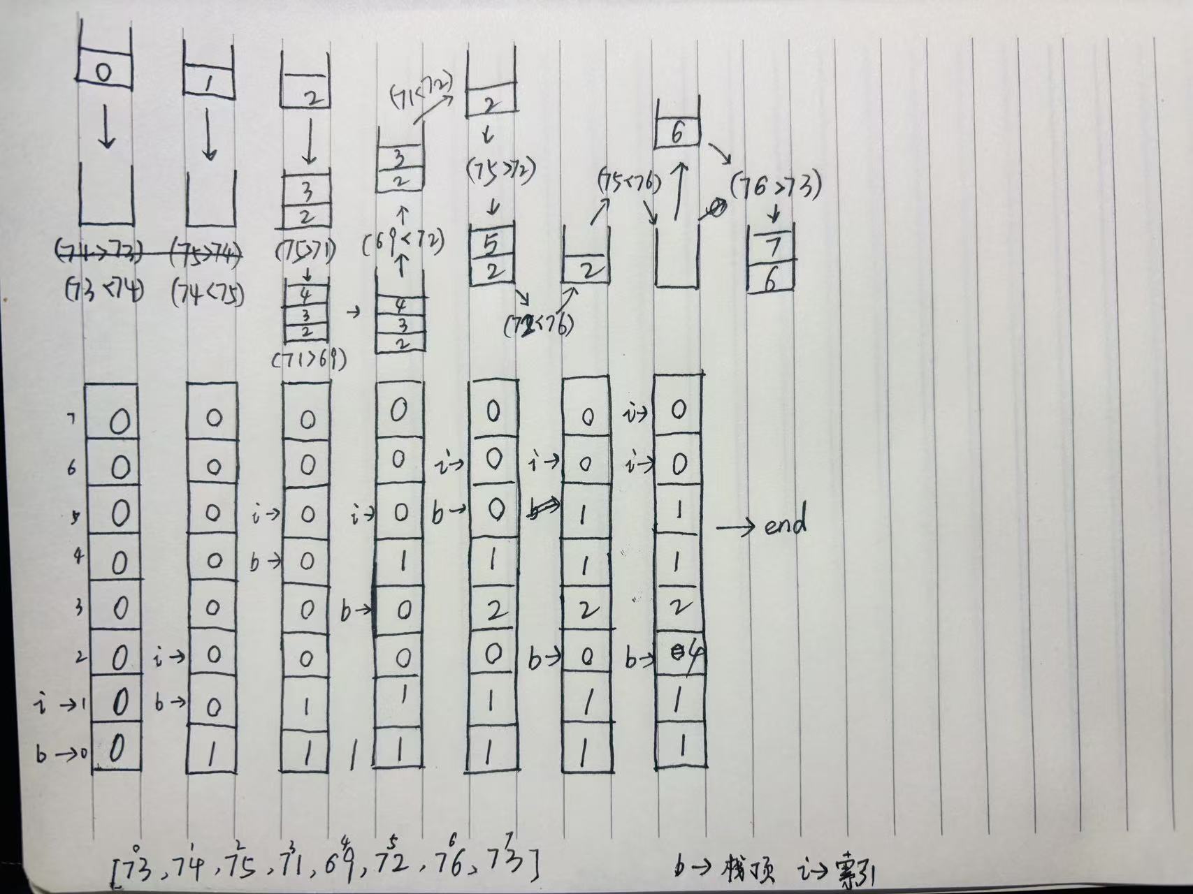 具体思路就是,首先定义两个栈,一个用来存放最终的答案,一个用来暂存需要比较元素的索引,第一步咱们将答案栈的所有值赋值为0,然后利用for循环的遍历,先将第一个元素,暂存入stc栈中,然后将温度数组中的后续元素与之比较,如若大于,则将两元素索引差传入答案栈,并且弹出stc栈的栈顶元素,否则将其传入stc栈中,紧接着进入下一层循环,再将stc栈的栈顶元素与后续元素进行比较,与前面重复相同的操作。